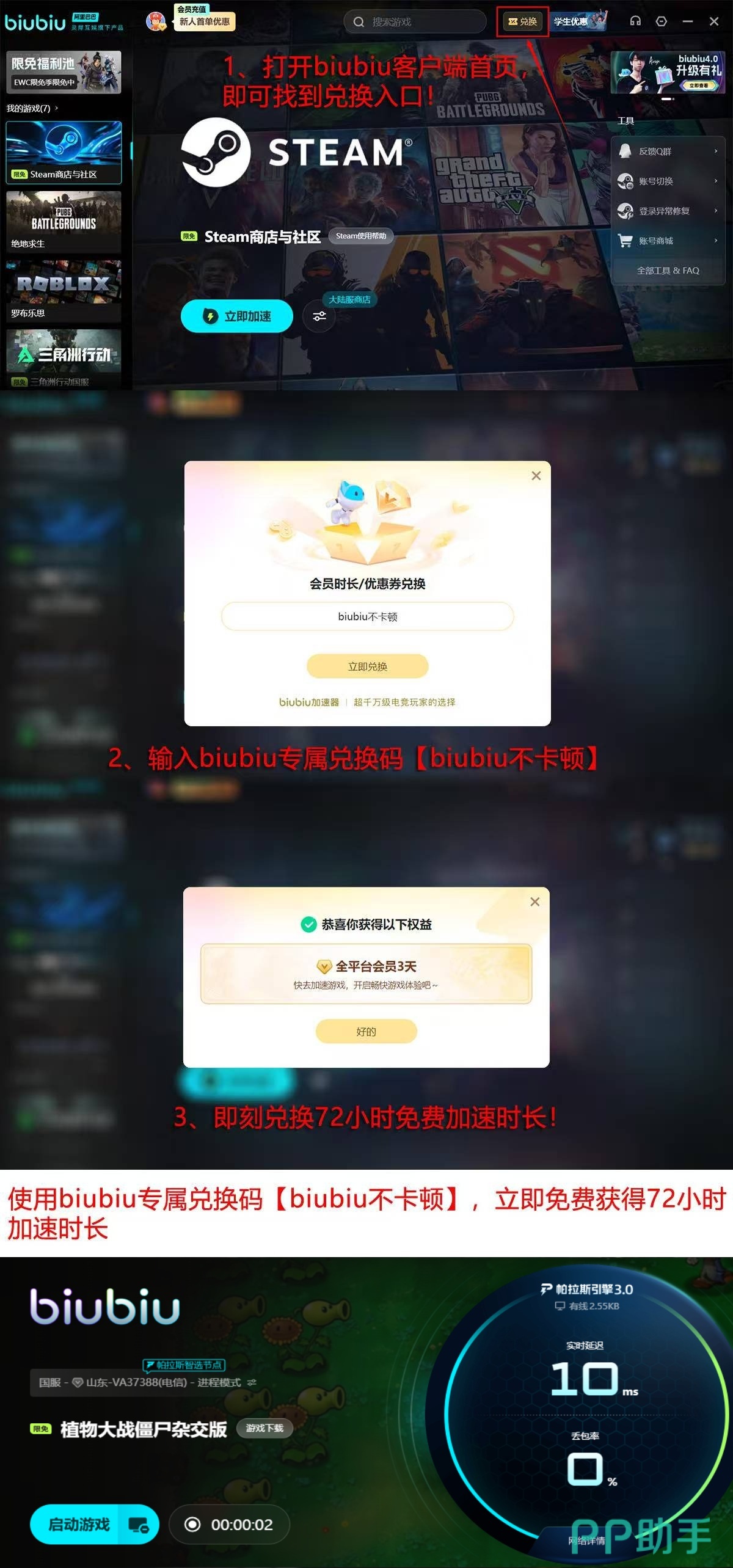 为降低用户尝试门槛,当前推出限时新人福利:完成注册即可获赠24小时免费加速时长;体验期结束后,输入口令码【biubiu不卡顿】还可额外领取72小时高级会员权限。两项权益支持叠加使用,总计可享96小时无限制加速服务。通过充分试用,玩家能直观对比优化前后在帧率稳定性、加载速度及联机连贯性等方面的实质性提升。