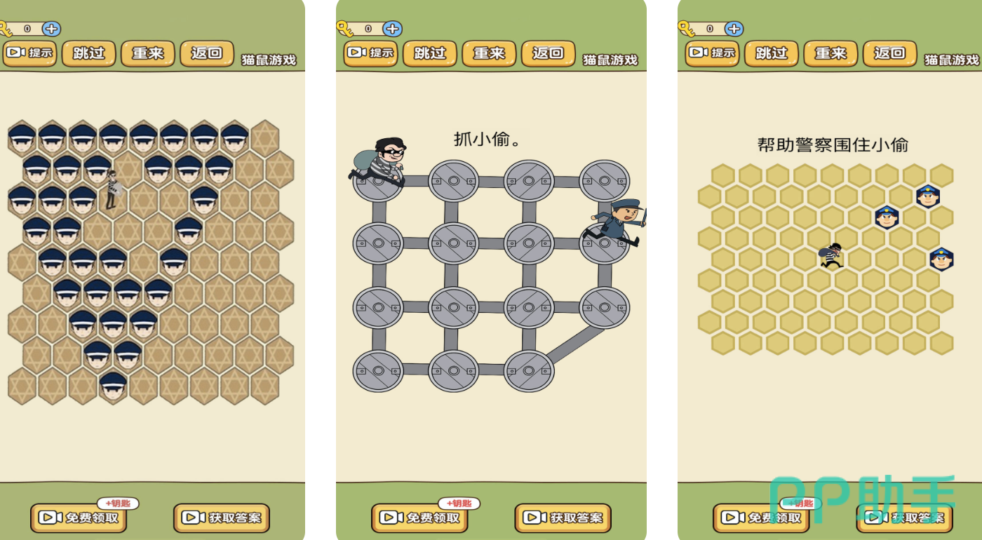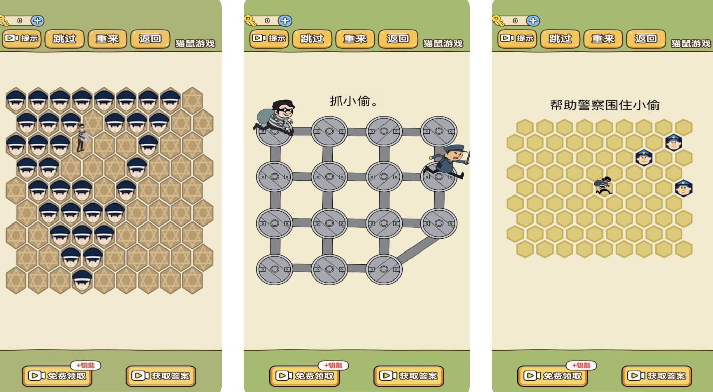 延续网格围堵机制,本作进一步简化交互逻辑,采用单点触控部署警力的方式。玩家只需在指定空格点击放置警察单位,系统自动判定是否形成有效闭合区域。若包围链存在缺口,小偷将立即突破逃逸。整体节奏舒缓,无时间压力与复杂数值系统,覆盖全年龄段用户,特别适合碎片化场景下的轻松游玩需求。
