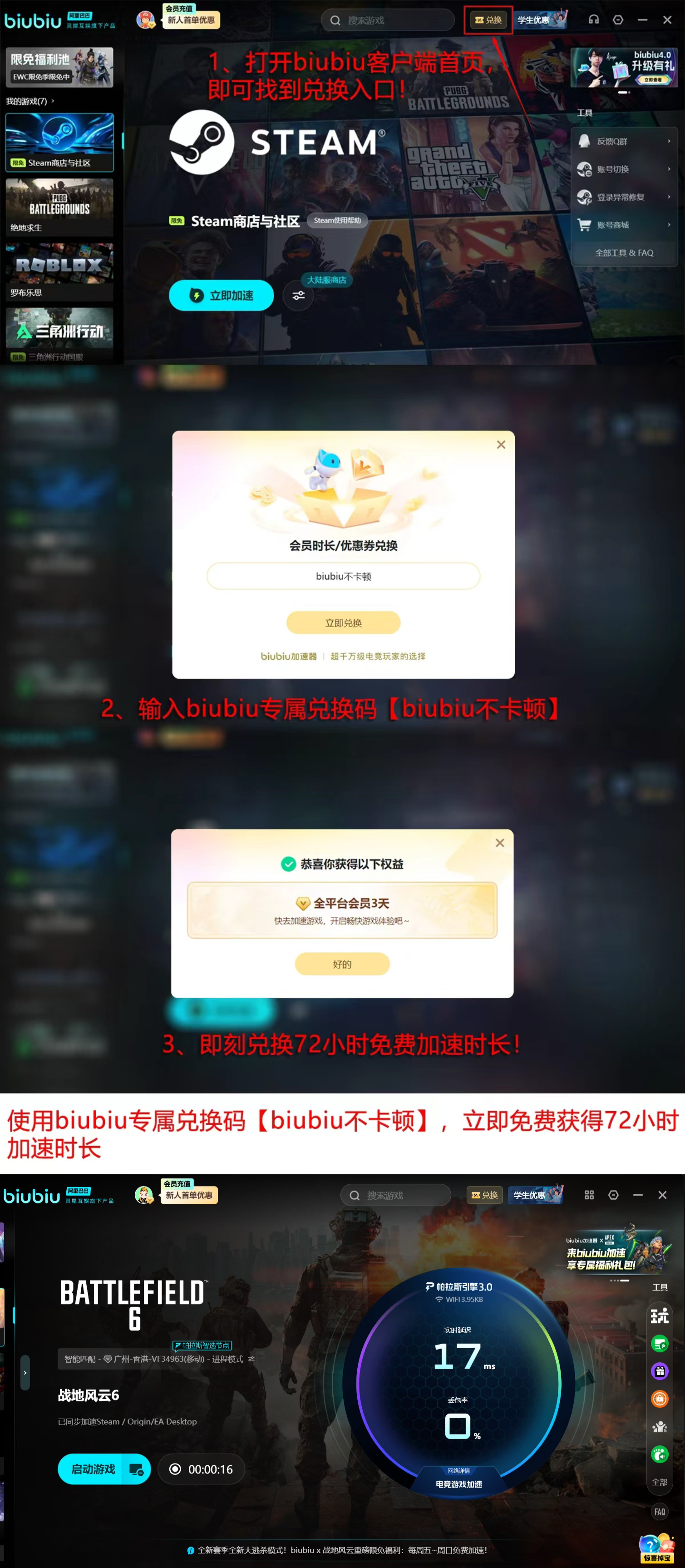 针对用户决策成本问题,biubiu加速器提供零门槛试用机制:完成基础账号注册即可激活24小时全功能免费加速权限;同时开放通用兑换码【biubiu不卡顿】,所有用户均可无条件领取额外72小时加速服务。该策略兼顾体验深度与使用灵活性,便于玩家在实际对战环境中验证稳定性改善效果。
