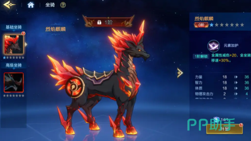 首先登场的,那自然就是烈焰麒麟,这就是金色品质的坐骑。作为基础坐骑,并不需要复杂的解锁条件,上线之后马上就可以激活,对新手玩家还是很友好的。烈焰麒麟在初始状态下就会有智力,力量,还会有体质属性加成。魔法攻击力,还有物理全部都会同步提升,搭配三维双攻的全面增益,自然就可以填补当前的战斗力空缺。当坐骑升级到一阶时,就会解锁被动技能元素加护,性价比更是直线飙升。有30%的骑乘移动速度,不管是跑图探索还是副本转场,都是比较高效。