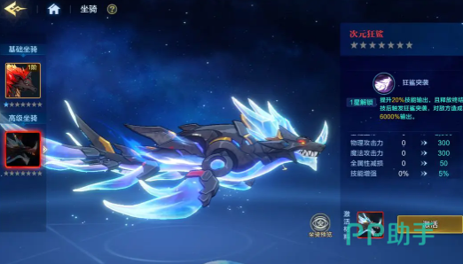 而另外一个就是次元狂鲨,是红色品质的高级坐骑,也是许多高端玩家的追求。这款坐骑没有办法直接解锁,而是只能通过圆满游玩法去获取。虽然目前还没有开放解锁的通道,但从技能描述来看,输出能力真的是特别厉害的。基础词条主要是聚焦双攻,还有百分比技能增强,在满级之后,魔法攻击力还有物理攻击力都可以突破300点。技能增强更是达到了5%纯输出向的属性配置,也会让它成为一把利器。