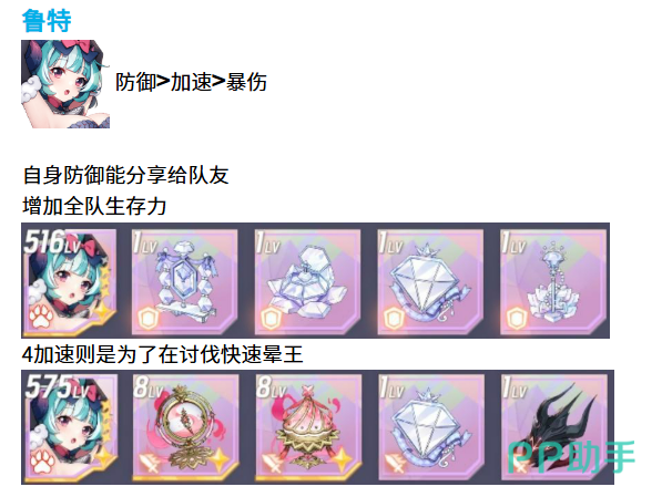 鲁特是野兽型里面比较特殊的存在,她自带防御共享机制。这个机制决定了她的防御越高,整个队伍的生存能力就越强。所以给鲁特配装的时候,防御属性要放在第一位。当然在某些讨伐战里面,也可以给她穿加速装备,方便更快地打出眩晕效果。