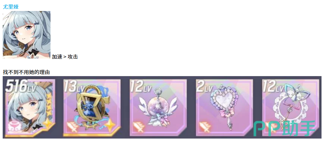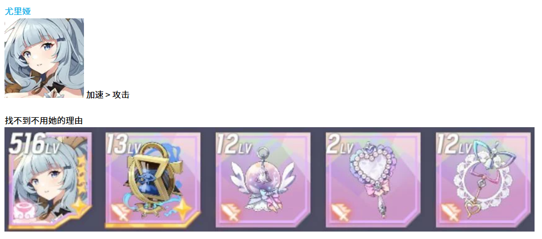 先说尤里娅这个角色,她在天使型里的地位基本上是无可替代的。配装方面主要看两个属性,加速是第一优先级,其次才是攻击力。为什么要这么选呢,因为尤里娅的技能机制决定了她需要频繁出手,加速堆得越高,回合轮转就越快,能够更多次触发她的辅助效果。攻击力虽然也重要,但排在第二位,毕竟她不是纯输出位,主要还是靠技能来带动队伍节奏。装备选择上优先考虑带加速词条的套装,副属性也尽量往加速上靠,这样才能把尤里娅的作用发挥到最大。