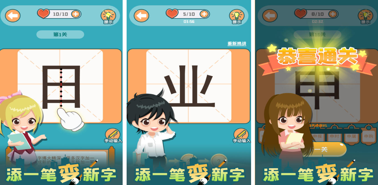 这一款游戏相较上一款游戏拥有着更深的理解,更适合年纪偏大一点的小孩,它不仅可以通过添加笔画来改变汉字的结构,更是增加了笔画移动的功能,让组合汉字变得更加灵活,为玩家们带来各种组合新汉字过程的挑战,原本添上笔画已经让文字变得更加丰富,而现在可以移动部首更是让整个游戏变得更加灵活对于小伙伴们的文字认知有着很大的挑战。