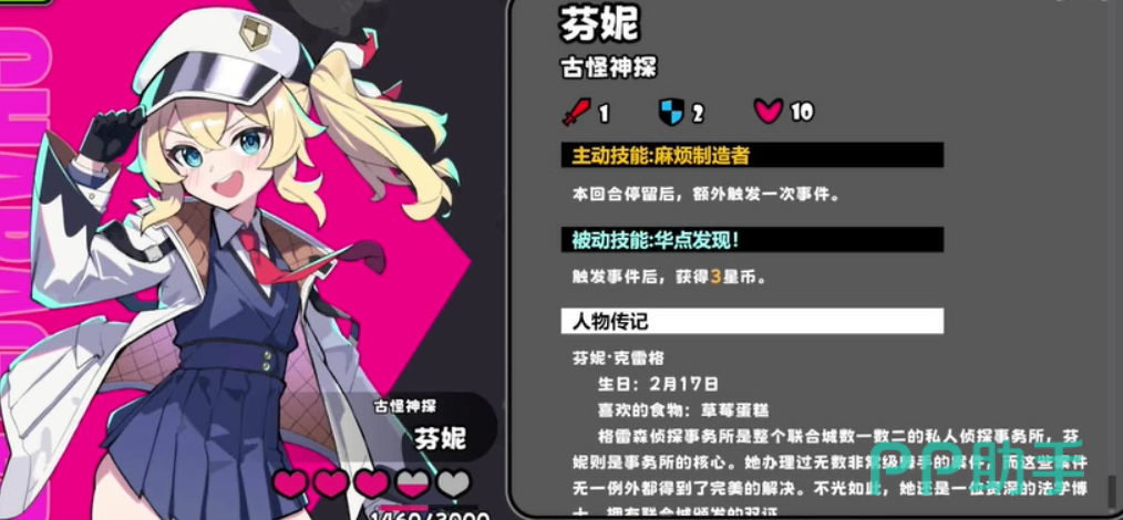 该角色本名为芬妮·克雷格,生日为2月17日,个人偏好草莓蛋糕,性格设定偏向亲和灵动。基础数值方面,她拥有5点金钱收益加成,战斗能力为2点,操作性能为1点;属性面板为1攻、2防、10血,整体定位偏向稳健型辅助角色,各项能力分布均衡,既无突出长板,也无致命缺陷。