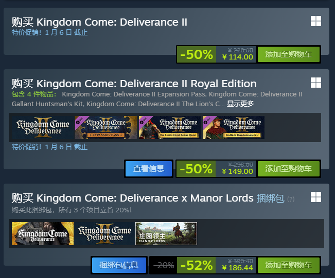 《天国:拯救2》史低价格是多少?这款以沉浸式中世纪体验和写实美术风格著称的RPG新作,自公布以来持续引发玩家热议。不少用户因售价门槛暂缓入手,但随着主流平台开启限时促销,其历史最低价已正式揭晓——当前Steam国区标准版仅售114元,皇家版为149元,较原价直降50%。本次折扣活动将于1月6日结束,有购入计划的玩家建议及时下单。