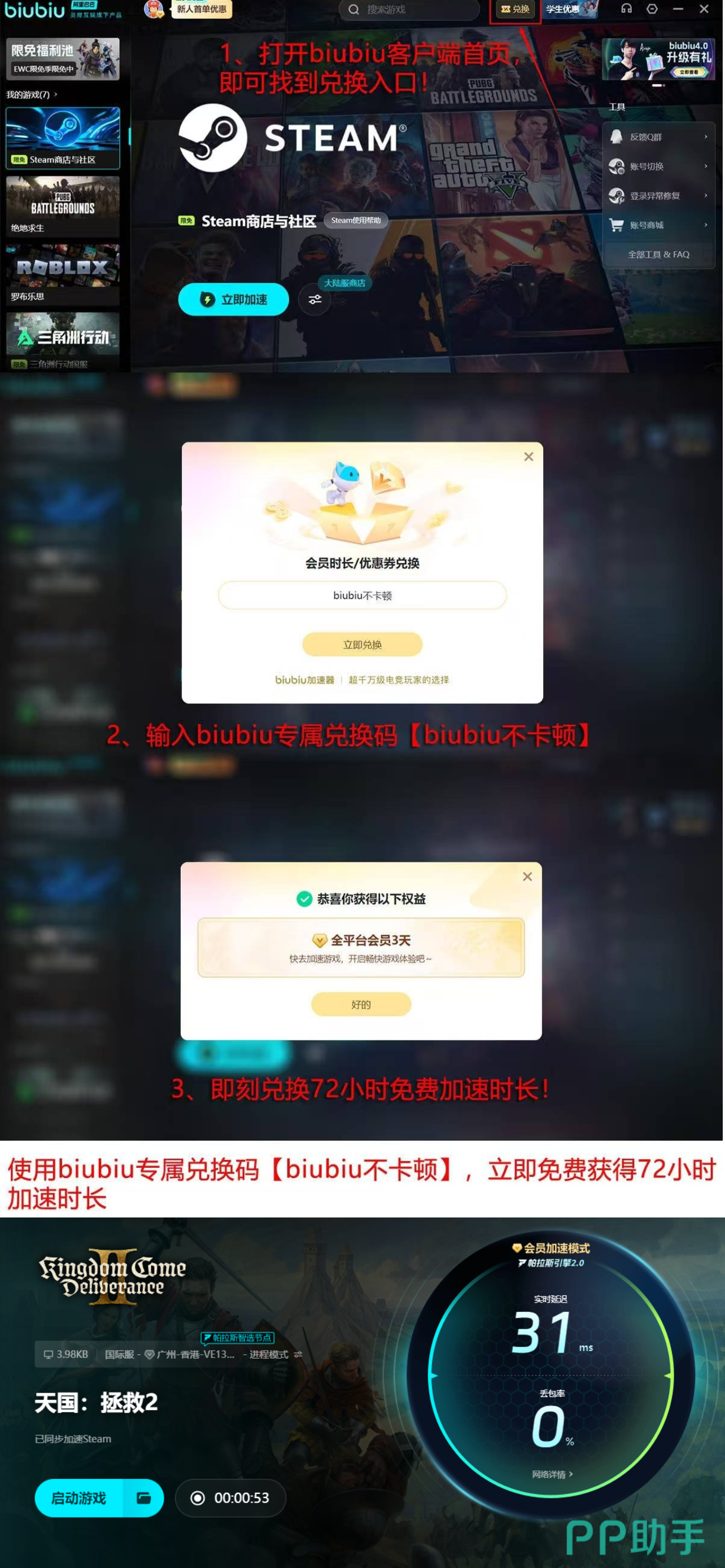 新注册用户还可享受多重入门权益:首日即可领取24小时全节点加速权限;另设3日通用体验时长,覆盖全部加速场景,且无需充值。参与方式为输入口令【biubiu不卡顿】至指定入口领取。