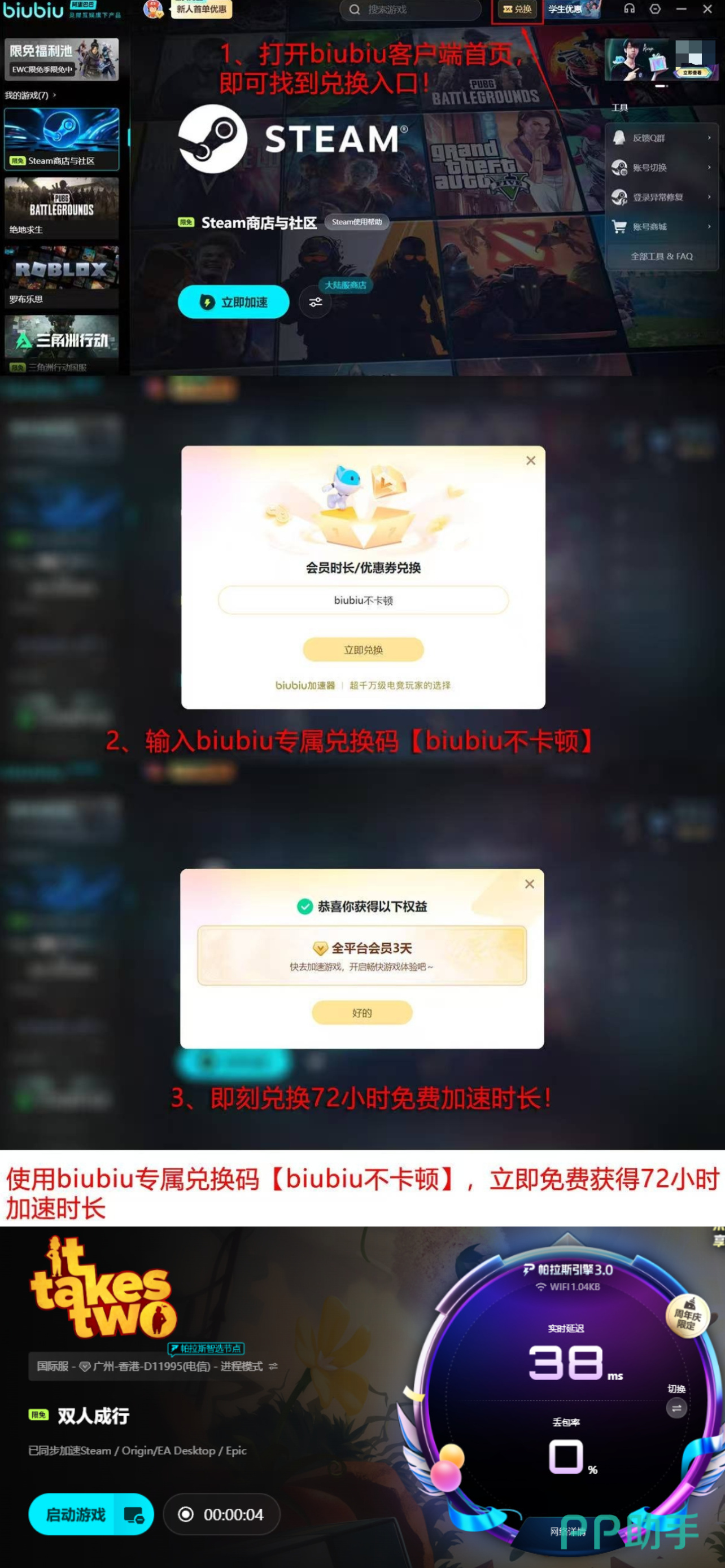 新注册用户可直接获得24小时完整功能试用权限;所有账号还享有统一发放的三日高级体验期,领取方式不变:输入口令【biubiu不卡顿】即可激活指定区域服务权益。