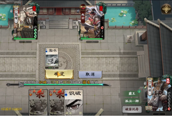 被动技“霸王”则赋予项羽独特的阵前交互能力:当其成为【判定牌】的目标时,常规判定流程被跳过,直接进入“阵前对决”结算;每次成功触发该效果,视为造成1点伤害;累计达成三次此类伤害后,自动获得一张【阵前对局牌】加入手牌。该机制使其在面对判定类干扰(如乐不思蜀、兵粮寸断等)时具备反制弹性,同时强化其作为核心输出位的生存韧性。