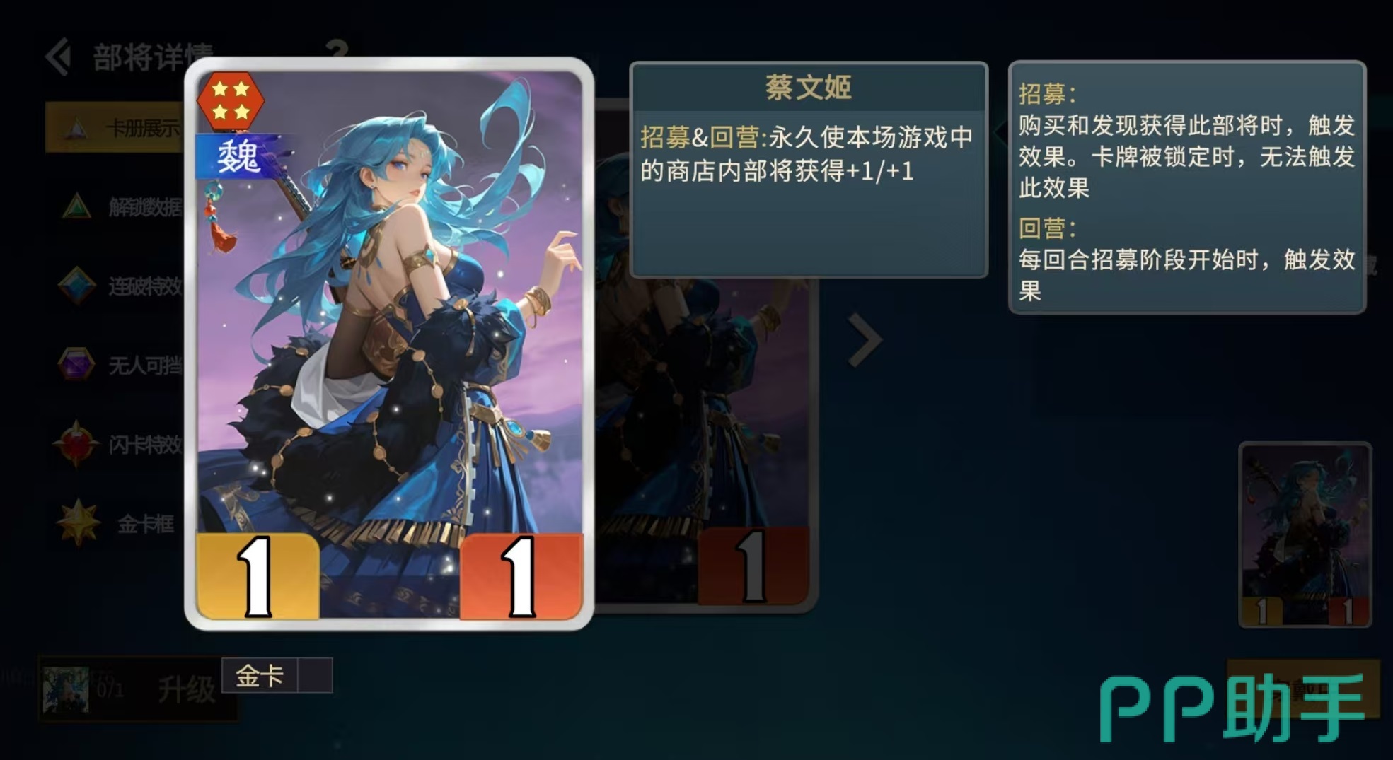 蔡文姬是整套体系的基石卡牌。其技能效果明确:每次招募或回营时,永久提升本局游戏中所有商店内武将1点攻击力与1点生命值;若为金色卡牌,则提升幅度翻倍至2/2。该效果不依赖场上单位,全程作用于商店池,大幅缩短优质武将的养成周期,是兼并效率跃升的核心前提。