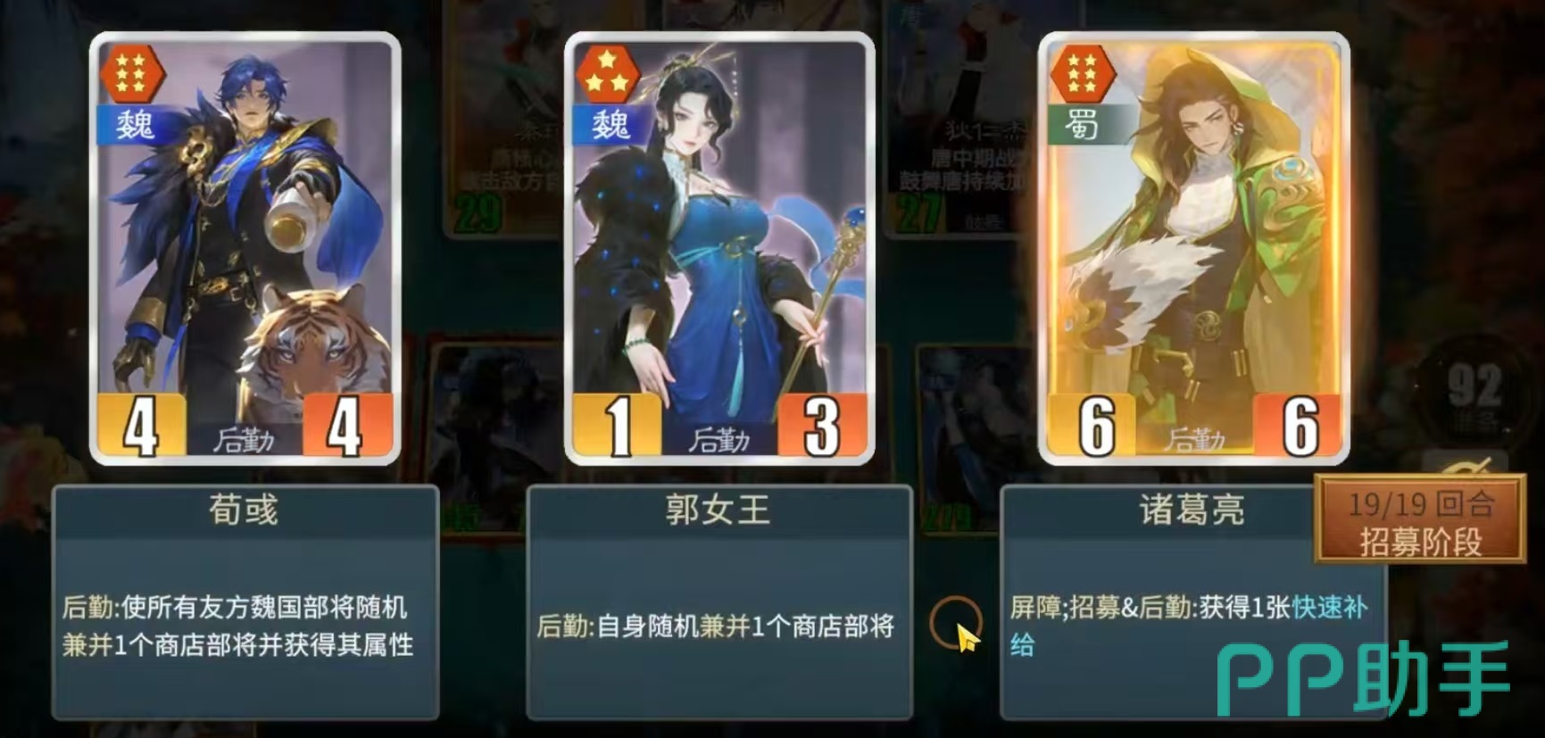 当前版本最具代表性的成型套路为“魏国兼并流”。该流派摒弃传统速攻或控制思路,转而依托商店机制与武将协同成长,通过持续抬高商店内武将基础属性,实现高效兼并、快速养卡与后期压制。阵容构建围绕夏侯惇、许褚、司马懿三张魏国核心展开,并辅以关键中立卡形成闭环。运营节奏强调前中期稳扎稳打,六回合内完成五本升级,确保在关键阶段精准捕获金卡核心,避免因搜卡过早导致经济崩盘。