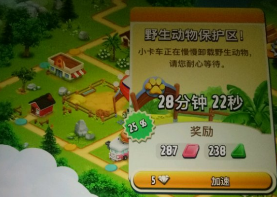 第二个步骤就是找到野生动物保护区,这个保护区的位置位于小镇当中。在外观上园区方有一些稻草,在点击之后就会显示对应的名字。那么找到园区之后,玩家需要将激活的动物卸载到园区当中。这个过程的时间是很长的,随着动物的等级上升,时间也会逐渐的增加。当然了,玩家也可以使用钻石来进行加速。