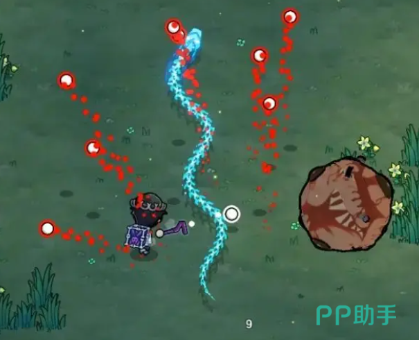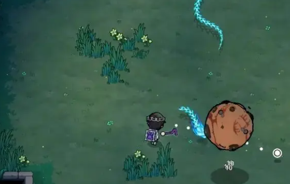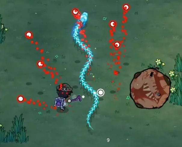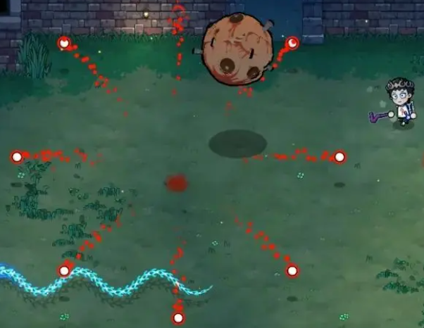 针对此招,推荐采用“贴身反制”策略:主动贴近Boss本体,使其弹幕完全落空。此时不仅规避伤害,还能抓住其落地硬直窗口进行连续输出。第二类攻击表现为身体拉伸—压缩—投射的三段式动作,最终发射一枚具备自动追踪能力的红色滚石。该滚石移动速度中等,但转向灵敏,持续时间较长。