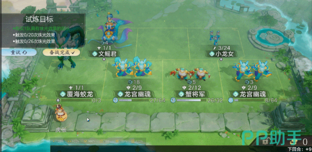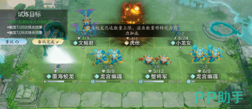 实战配置上,文鳐君与龟法师为必选核心,二者拥有全队最高的龙珠初始产量与回合结束产珠效率,是整套体系的能量基石。龙宫幽魂与四海龙王则承担珠光转化加速职能:前者提升珠光获取概率,后者缩短珠光生效间隔,共同保障蟹将军在中后期高频触发增殖效果。