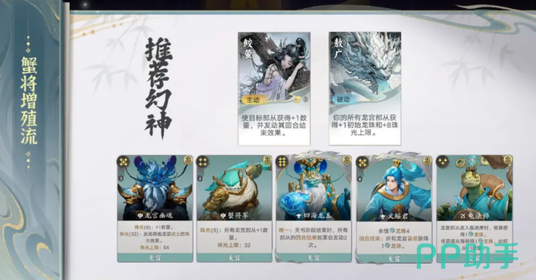 站位设计需突出能量传导逻辑:将蟹将军与龙宫幽魂置于文鳐君或龟法师相邻位置,确保每回合结束后的龙珠能即时转化为珠光并被就近吸收;同时,优先选用敖广作为幻神,因其提供初始龙珠及更高珠光上限,可显著提升前期启动速度;鲛萤作为另一优选幻神,凭借自带回合结束效果,进一步压缩珠光充能周期,使增殖节奏更加紧凑。