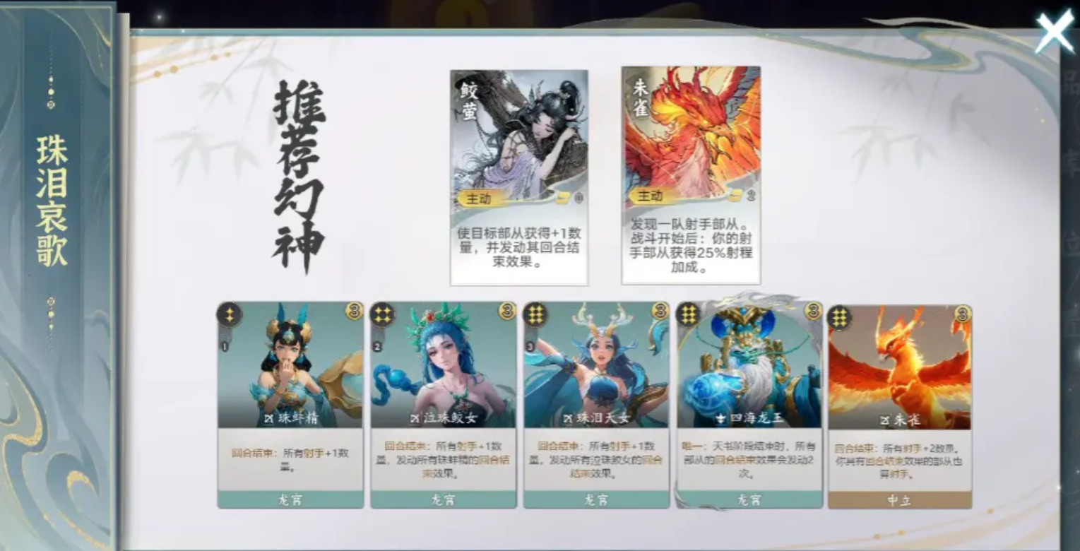 构筑核心聚焦三张专属射手:珠泪天女、泣珠鲛女、珠蚌精。她们均具备“回合结束时为己方射手提供数量加成”的固有技能,构成持续成长的基础链路。辅助位需配置朱雀(提供额外数量加成)与四海龙王(强制再次触发回合结束),由此形成闭环式增益循环,使射手数量随回合推进呈阶梯式攀升。
