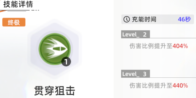 普通攻击采用远程重型狙击模式,锁定单一目标施加高额物理伤害,技能等级提升可直接强化该伤害倍率。专属特技“连续狙击”可向前方区域发射三枚高穿透力狙击弹,每发均附带显著物理伤害倍率,同样支持通过升级提升总输出效能。
