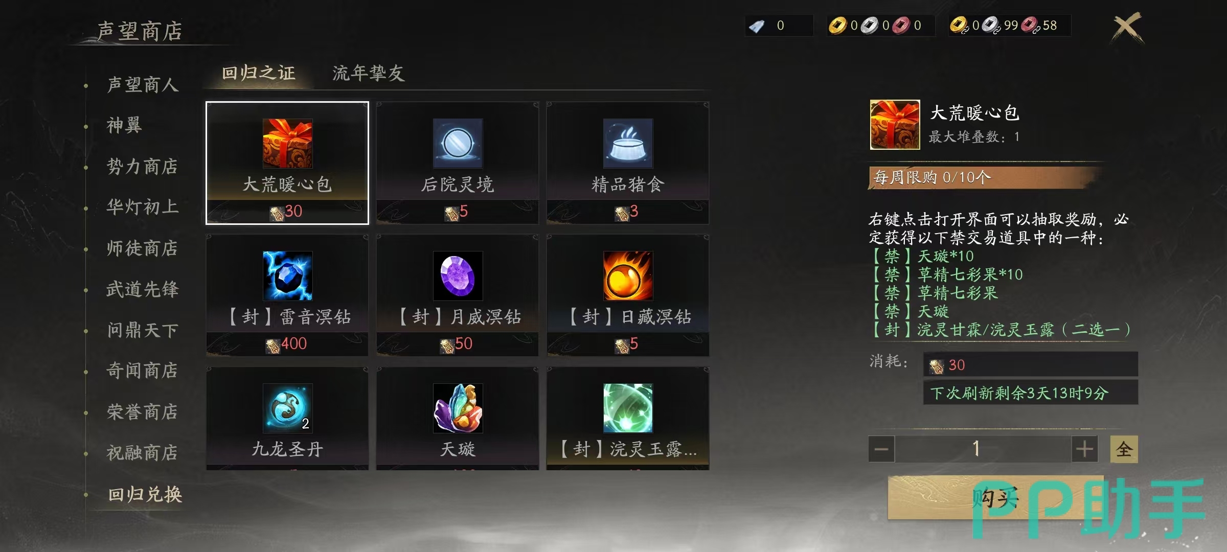 “炼化声望”服务于装备深度养成体系,玩家消耗炼化之灵或元宝进行炼化操作时,将按比例转化为该声望。积累后可用于激活炼化界面中的额外属性加成槽位,显著提升装备基础战力。“大荒钱庄声望”聚焦高风险高回报玩法,主要产出途径为参与“饕餮讨伐战”——成功击败目标BOSS后有概率掉落武库密钥,右键使用即可直接获得声望;另在特定消费返还活动中亦可稳定获取。“王朝军资声望”则与商城行为强关联,玩家在道具商城购买“国之恩典”或“国之恩赐”礼包并完成使用后,自动计入该声望账户。其应用范围覆盖广泛:既可在声望商人处兑换功能性道具,也可为已过期的外观类物品续期使用时效。