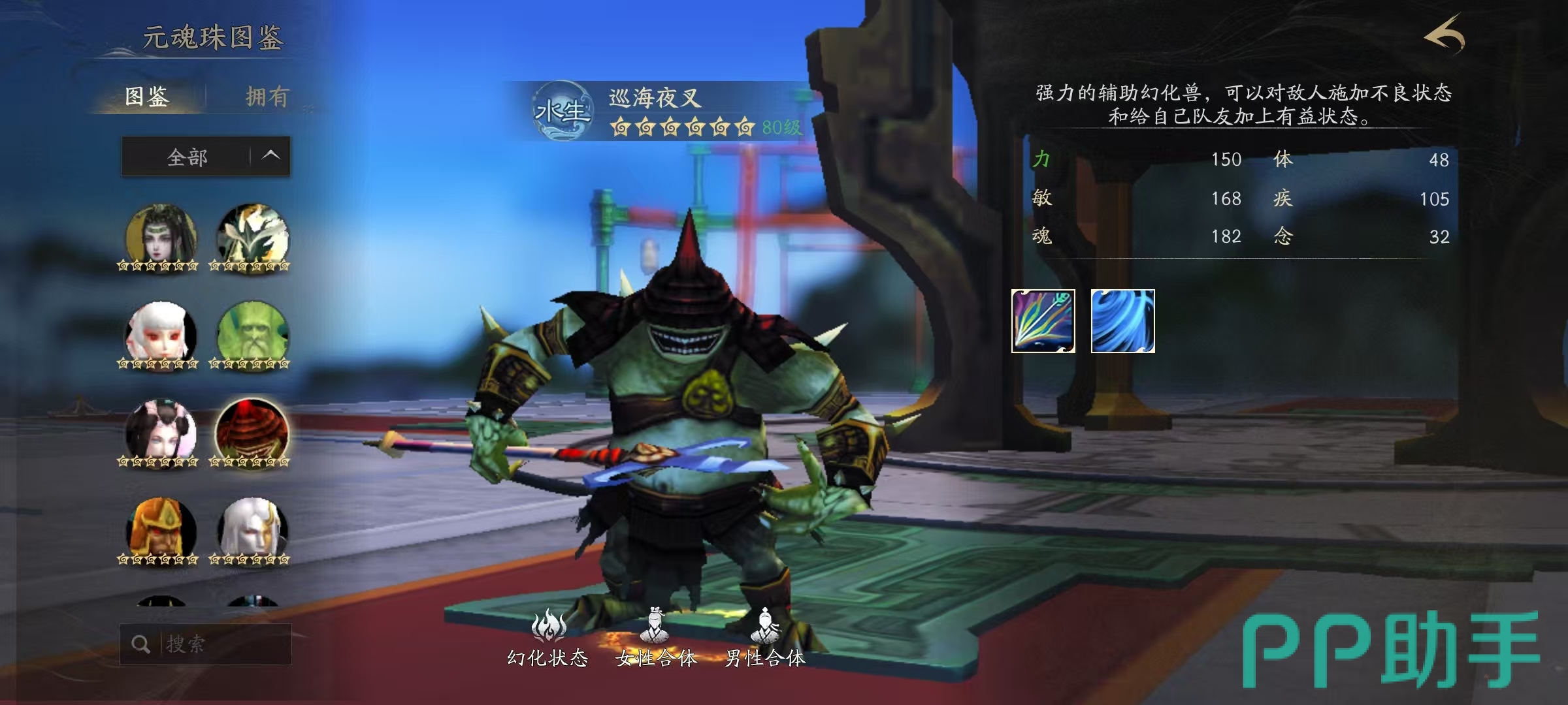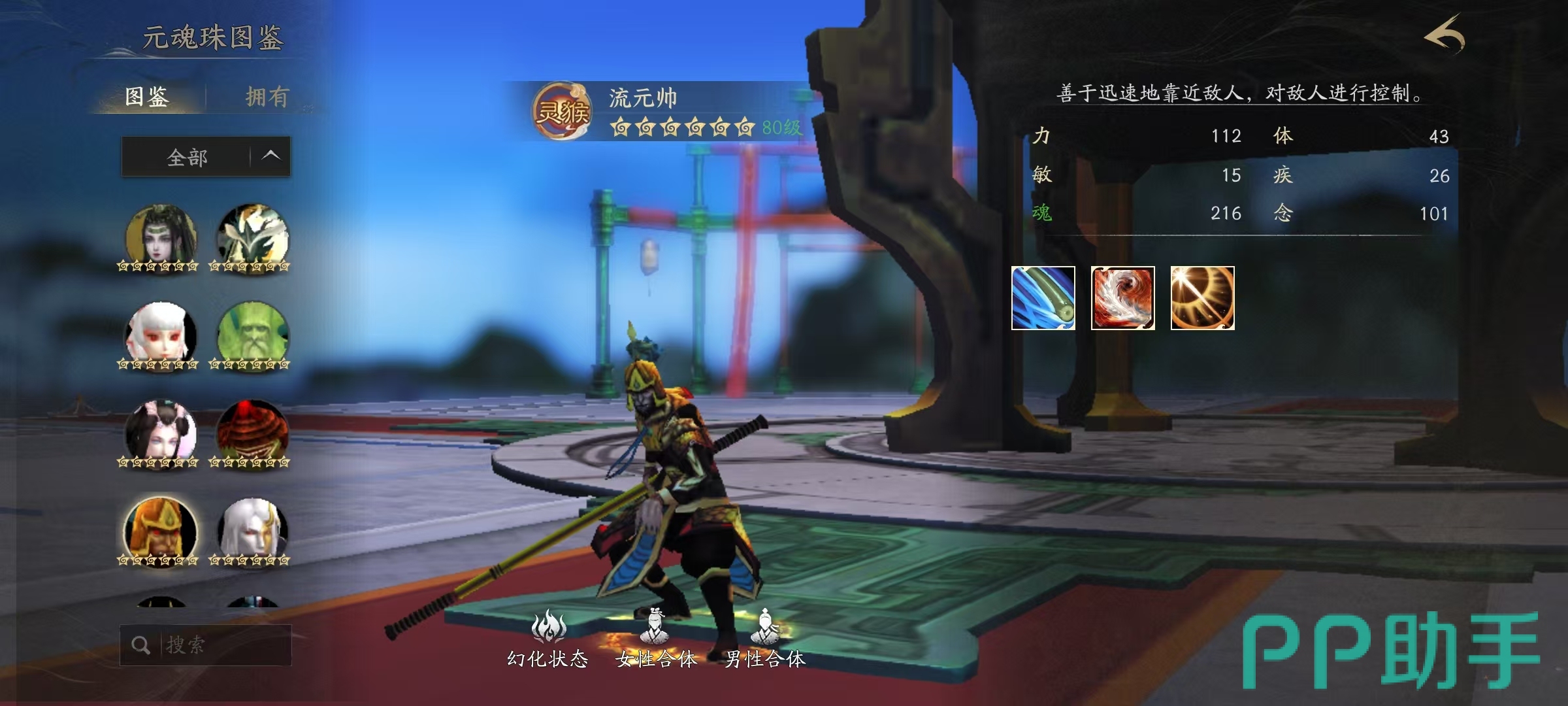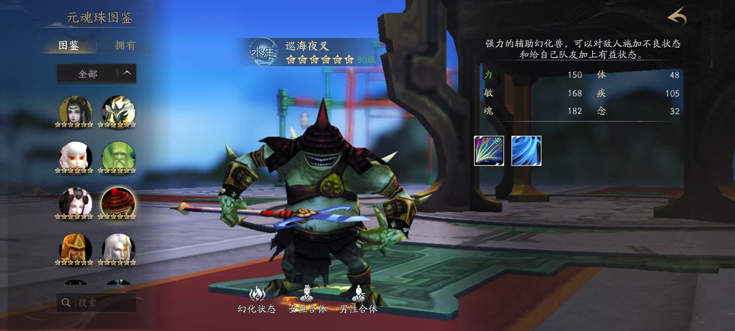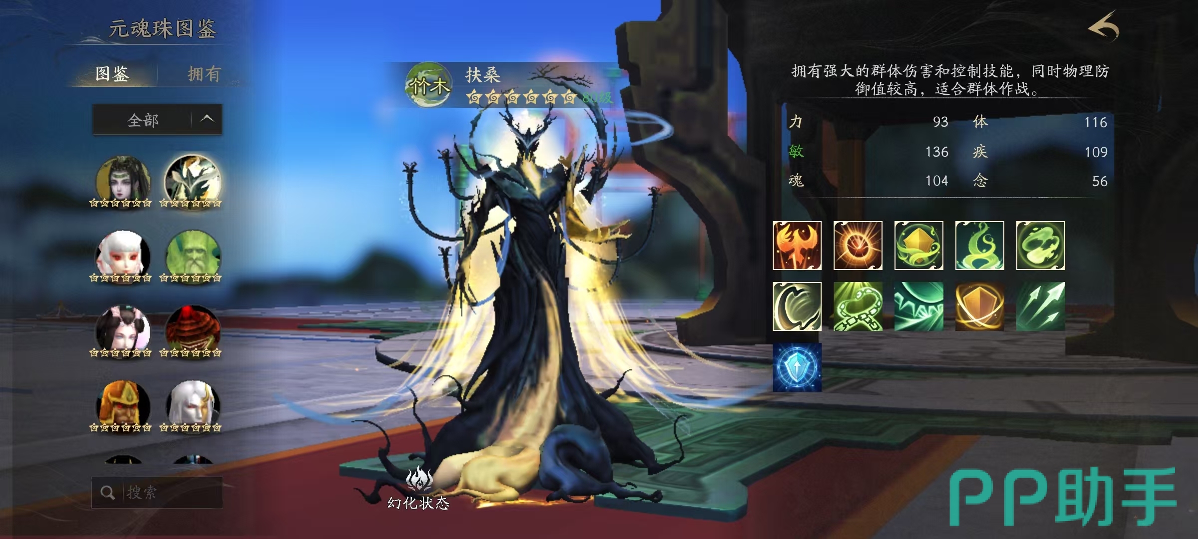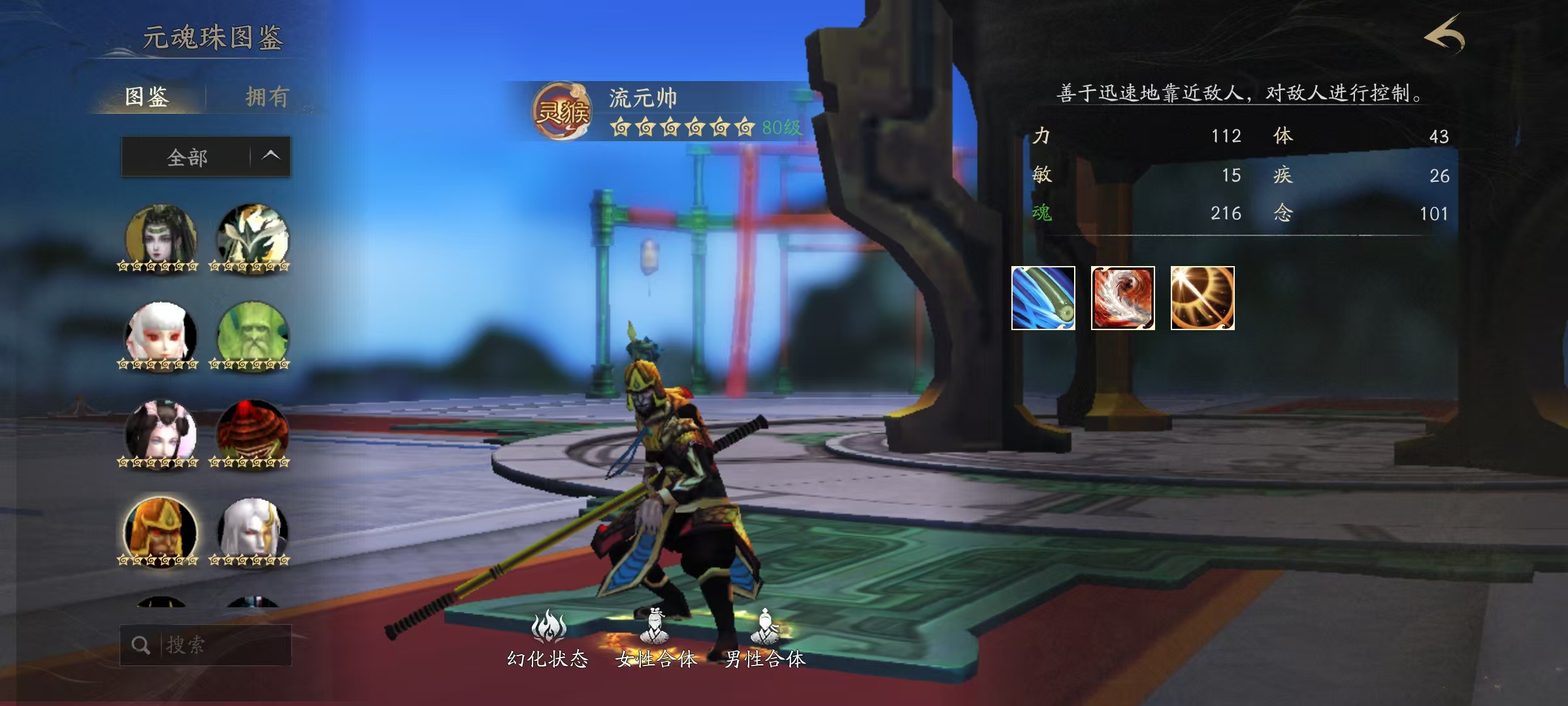 玩家可在主界面菜单栏中直接进入“元魂珠”功能模块,查看当前已拥有的全部元魂珠种类及其星级状态。该系统采用星级分级制,其中旱魃、扶桑、九尾妖狐属于顶级稀有元魂珠,对应最高星级。不同星级直接影响属性增幅效果——所有元魂珠在成功吸收后,均可为角色提供固定比例的基础属性提升,增幅统一为5%。