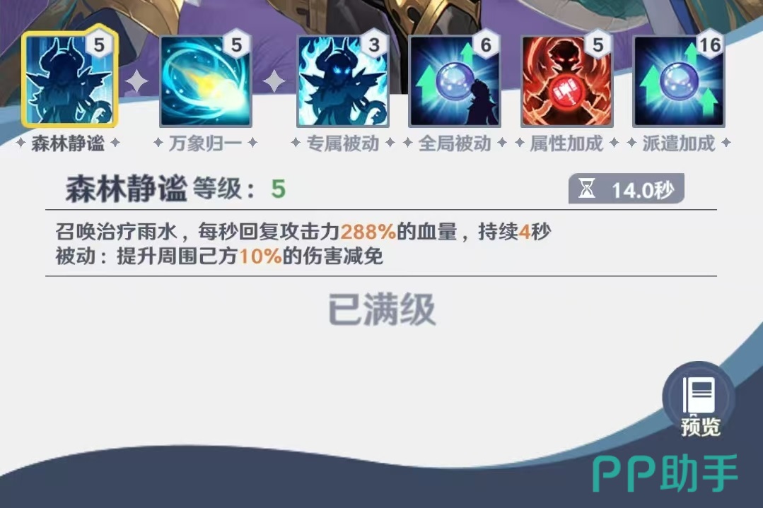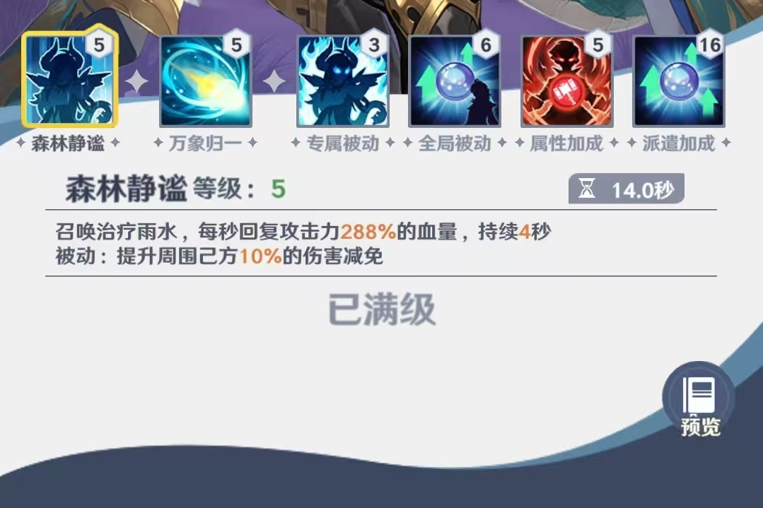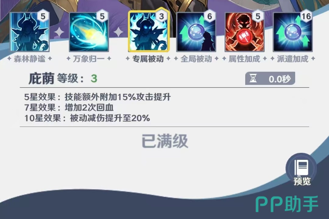 其专属被动【庇荫】随星级提升呈现阶梯式强化:五星解锁时,所有技能额外赋予全体友方15%攻击力加成;七星阶段新增两次【森林静谧】治疗触发次数;升至十星后,【坚韧庇护】的减伤效果提升至20%。该被动不仅放大了治疗与减伤的叠加收益,更通过攻击增益进一步激活全队输出潜力。在生活系统中,其全局被动【天纵奇才】使藏经阁资源产出效率提升90%;属性类被动【秘法研习】提供全体魂师15%攻击力与15%最大生命值加成;派遣专项加成【藏经专精】使其派驻藏经阁时获得200%额外资源收益,是当前版本中生活职业协同效率最高的角色之一。