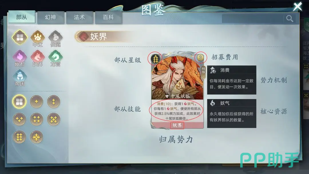 部从所属势力可在备战阶段通过天书界面直接确认。该界面不仅显示可招募部从列表,还同步标注其归属阵营、主动技能效果及所依赖的阵营专属资源。例如十尾妖狐明确归属于妖界,其存在可激活并强化“妖气”资源流转,进而提升同阵营其他部从的棋力数值。这种资源联动性是势力构筑的根本前提。