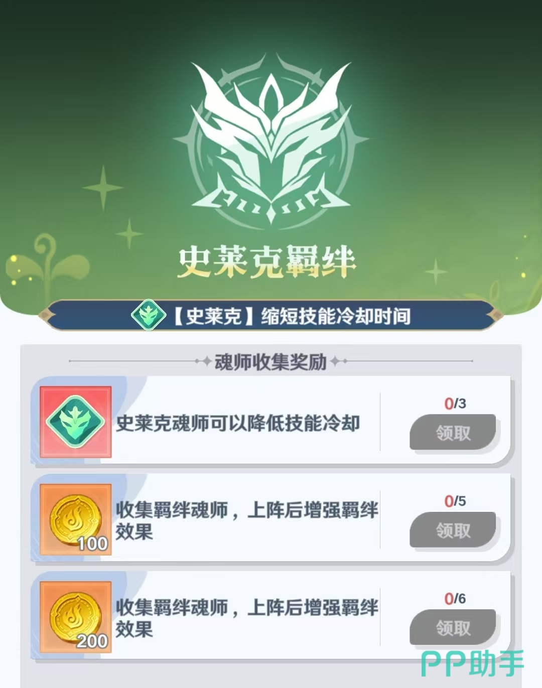 【史莱克羁绊】:激活条件为史莱克阵营魂师达指定人数。核心效果为缩短全体史莱克魂师技能冷却时间,最多减少1秒。此效果可加快大招循环频率,在持续压制与爆发衔接场景中优势突出。