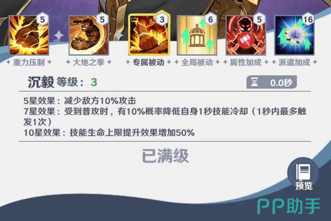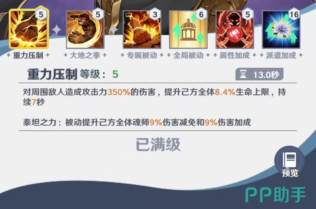 二技能“大地之拳”专注单体爆发,造成360%攻击力的高额点杀伤害。其专属被动“沉毅”随星级成长呈现阶梯式强化:5星时降低敌方10%攻击力;7星后新增普攻触发机制——受普通攻击时有10%概率减少自身1秒技能冷却(每秒至多触发一次);升至10星时,“重力压制”的生命上限提升效果额外增加50%。此外,全局被动“称霸一方”在最强宗门活动中提升24%积分获取效率;基础属性加成为全体魂师增加5%攻击与5%生命;派遣至种植园时亦享有专属加成。由此可见,泰坦巨猿并非传统意义的纯防御型角色,而是一个集减伤、增益、控场、反制与续航于一体的全能型前排。