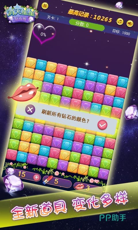 《消灭星星钻石版》为我们带来了更具有精彩活力的消除玩法,游戏运用了钻石结合星星的消除图标设计,整个游戏的图景铺设的更加悦目神怡,而且每一次星星进行碰撞,游戏都进行了一种犹如流星划过一般,华丽的动画消除效果,游戏还把各种极具新鲜感的消除任务以及障碍进行了穿插。