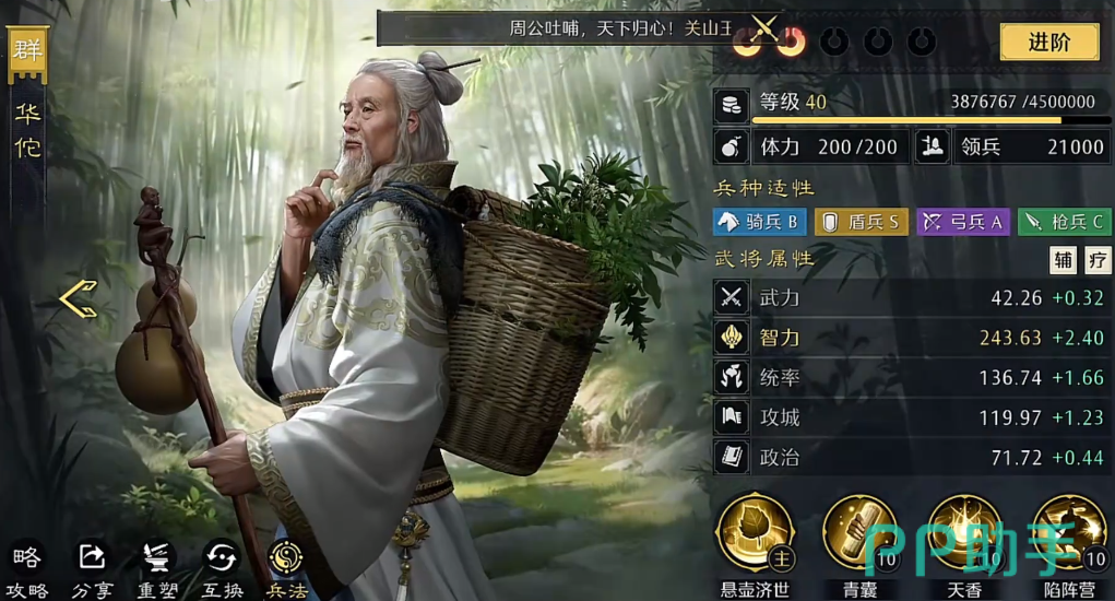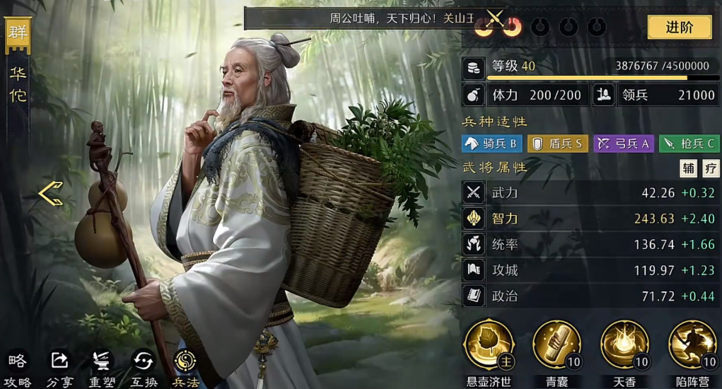 在游戏里,华佗需要挑选最合适的对手,也需要有兵法选择思路,这些兵法对于角色有极大的影响,奋鼓和乐善非常适合华佗,这两个兵法都可以提升治疗能力和治疗数量,惜兵爱民和活力技能可以保证角色的稳定性,想要组建一支更强力的队伍,输出成员是必须的,像华佗这样的辅助成员也必不可少,然后有了均衡的能力之后才能顺利击败对手,保证自己的队伍有更长的续航时间。