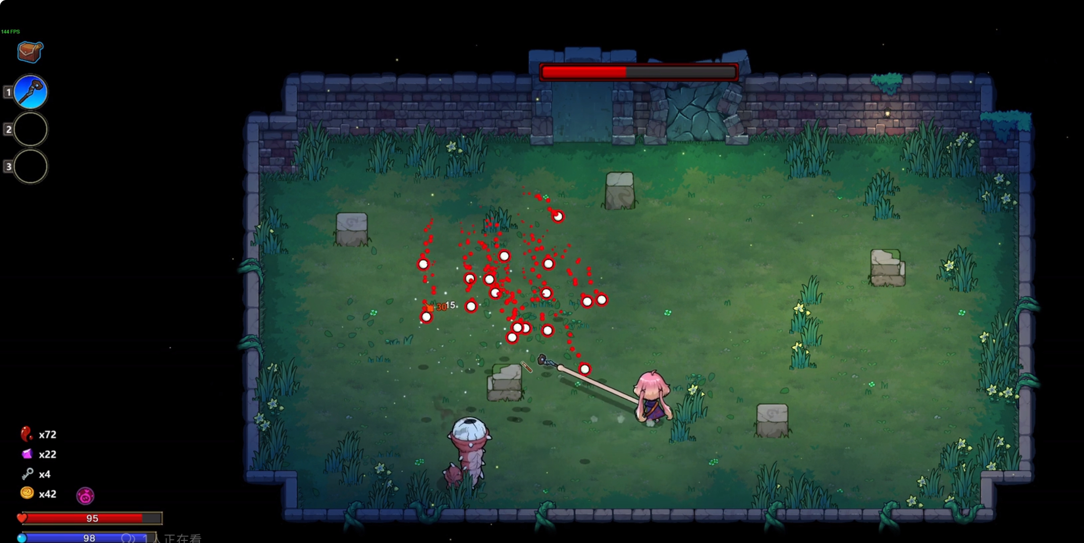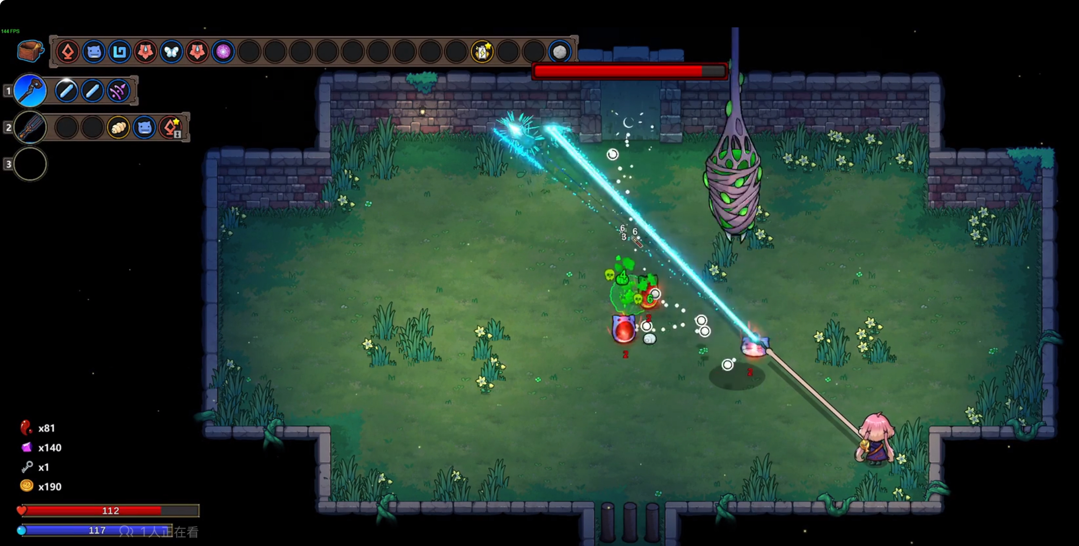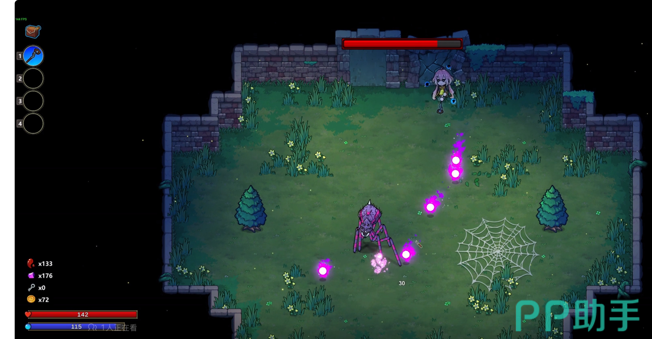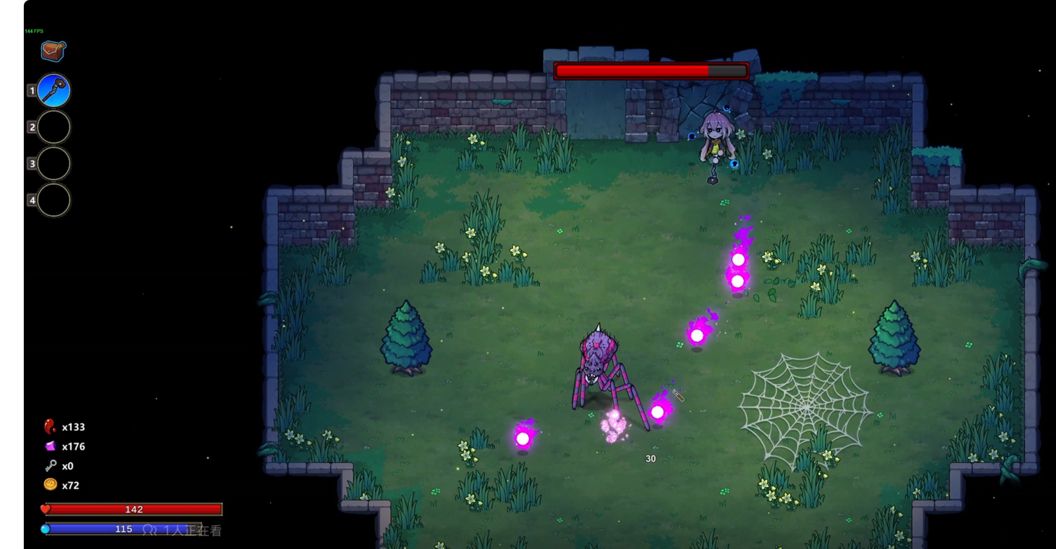 第一个精英怪:巨蛛,它的生命值是650,有三种攻击方式,第一个是发射8个弹幕,会从两个角度向外扩散,但中间是空的,我们只需要站远一点就可以躲掉了。第二个攻击方式是发射一排的弹幕,我们还是用走位和距离来进行躲避就可以了。第三种攻击方式是蓄力,会吐蛛网球,被击中之后会受到伤害值,蛛网球落地之后会成网,踩中的话就会被减速。我们需要提前预判蛛网球的落点,然后避开就可以了。总的来说,巨蛛难度不高,而且它血量低,我们用走位把它堵在角落里打败就可以了。