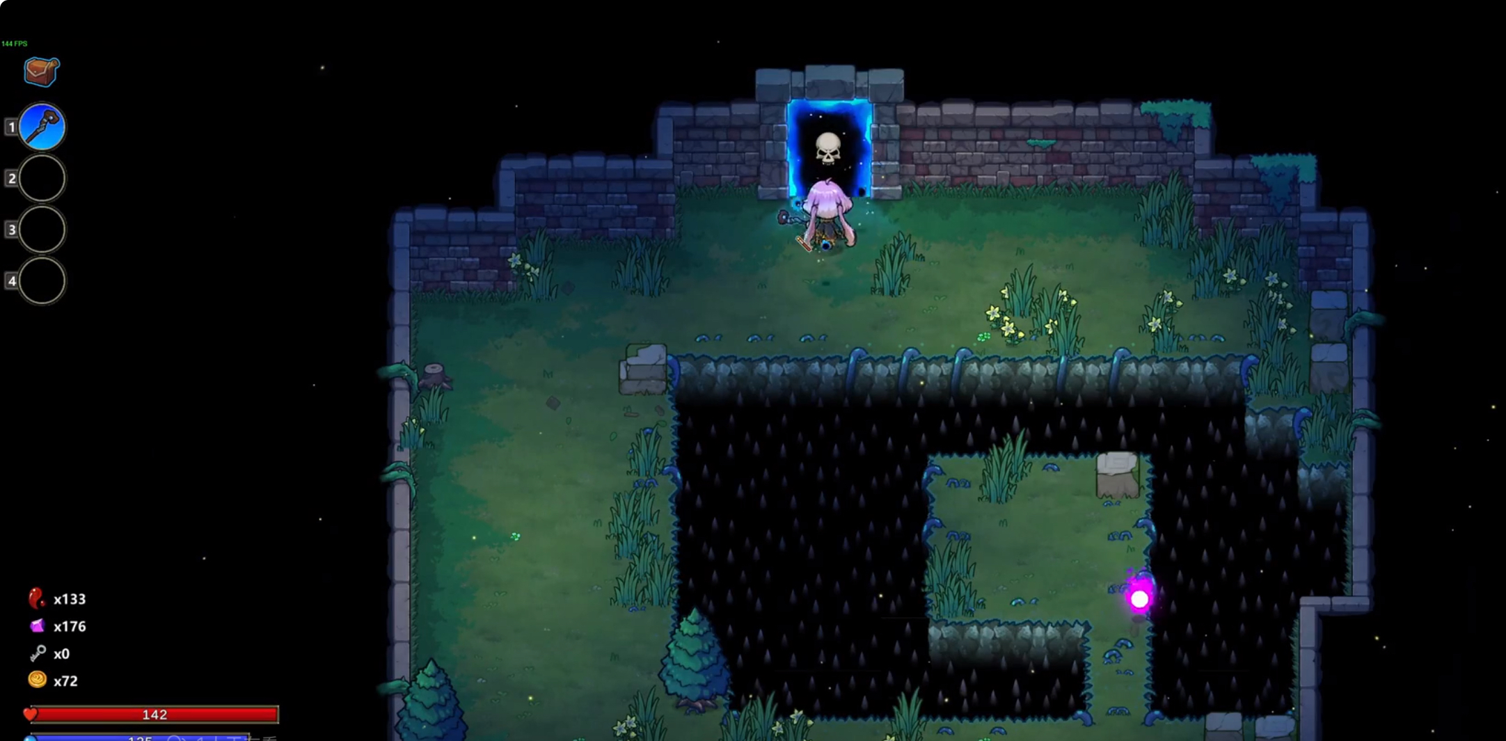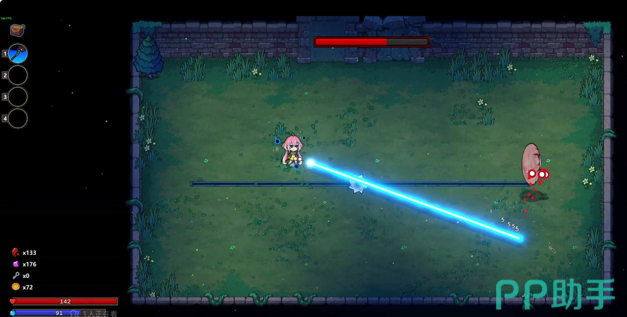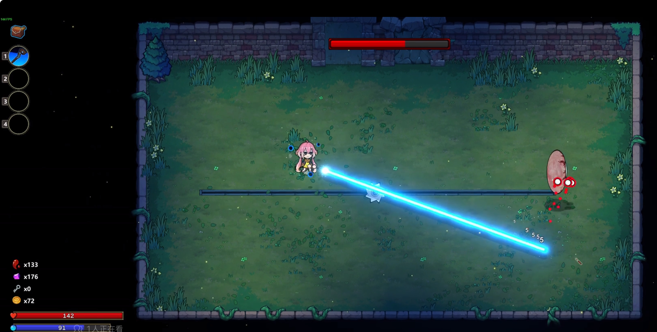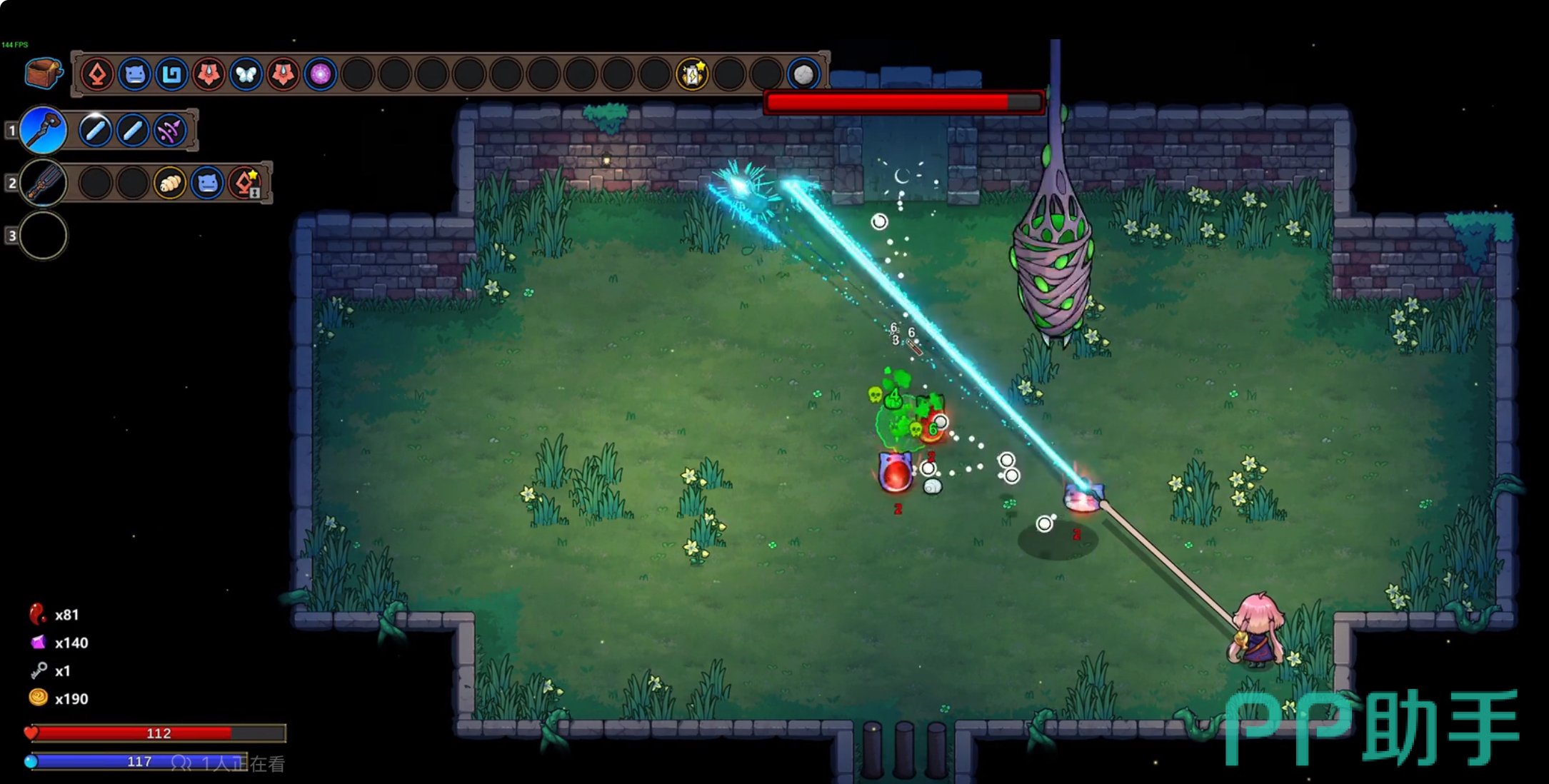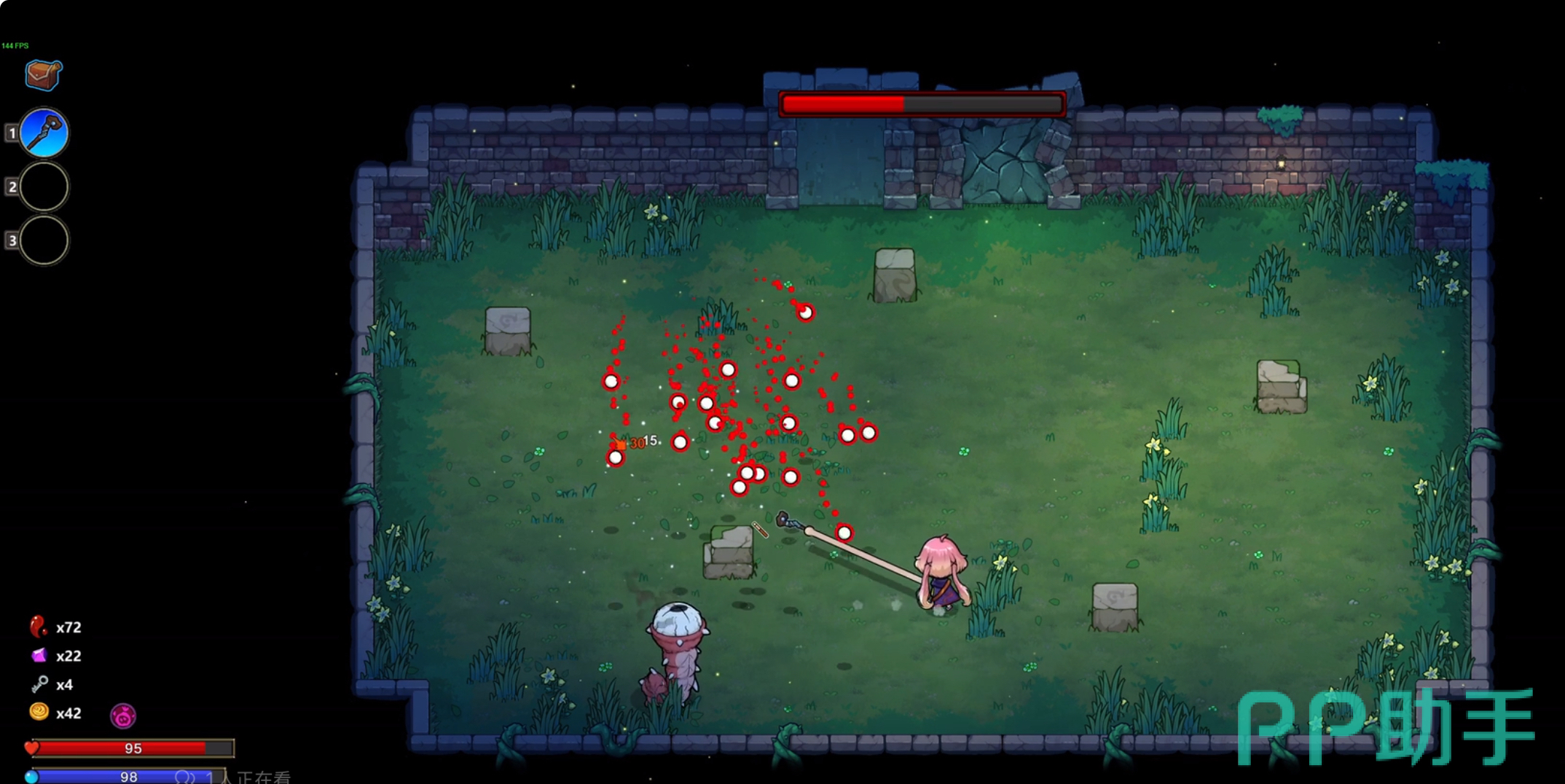 第一个精英怪:巨蛛,它的生命值是650,有三种攻击方式,第一个是发射8个弹幕,会从两个角度向外扩散,但中间是空的,我们只需要站远一点就可以躲掉了。第二个攻击方式是发射一排的弹幕,我们还是用走位和距离来进行躲避就可以了。第三种攻击方式是蓄力,会吐蛛网球,被击中之后会受到伤害值,蛛网球落地之后会成网,踩中的话就会被减速。我们需要提前预判蛛网球的落点,然后避开就可以了。总的来说,巨蛛难度不高,而且它血量低,我们用走位把它堵在角落里打败就可以了。