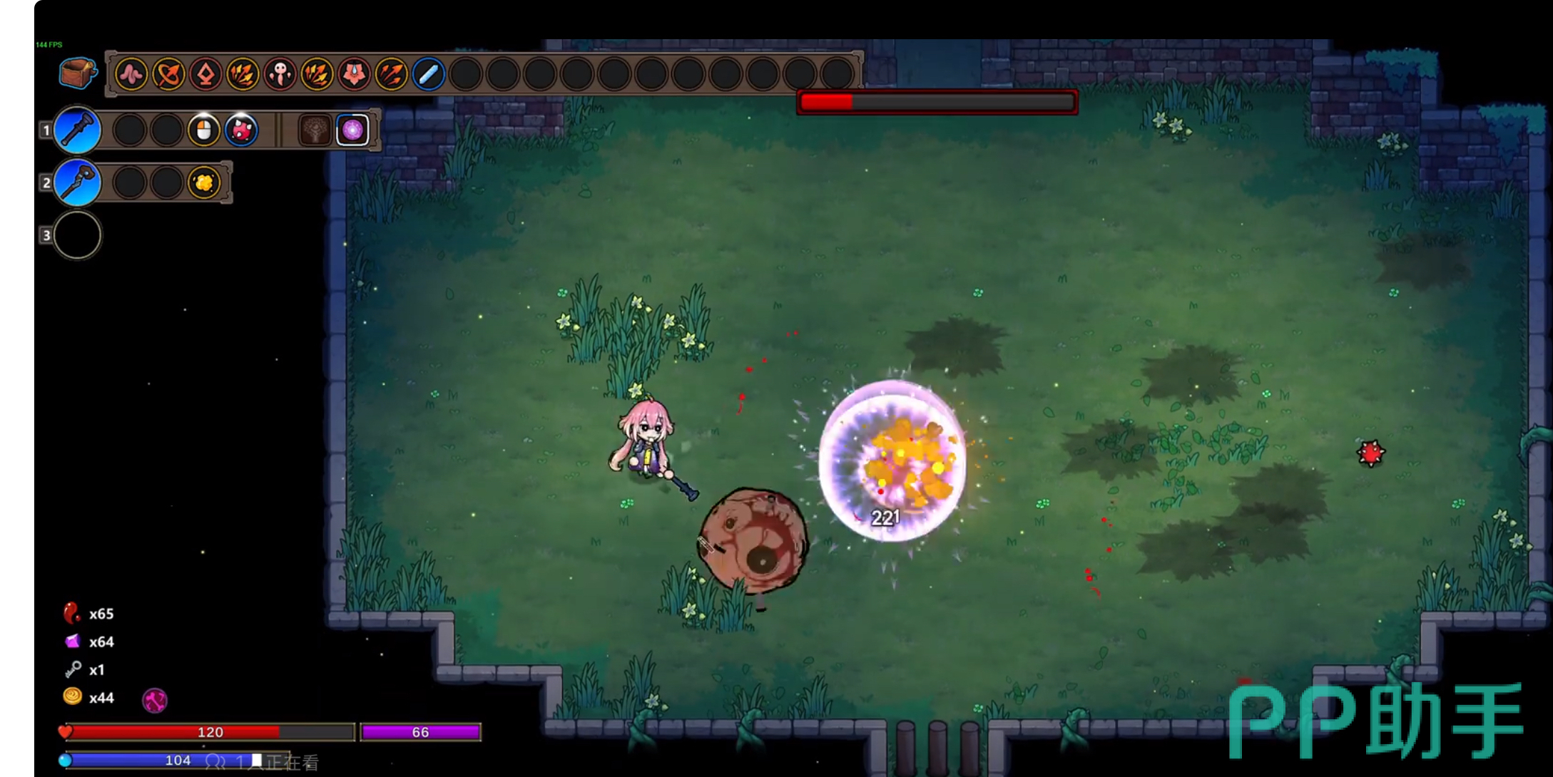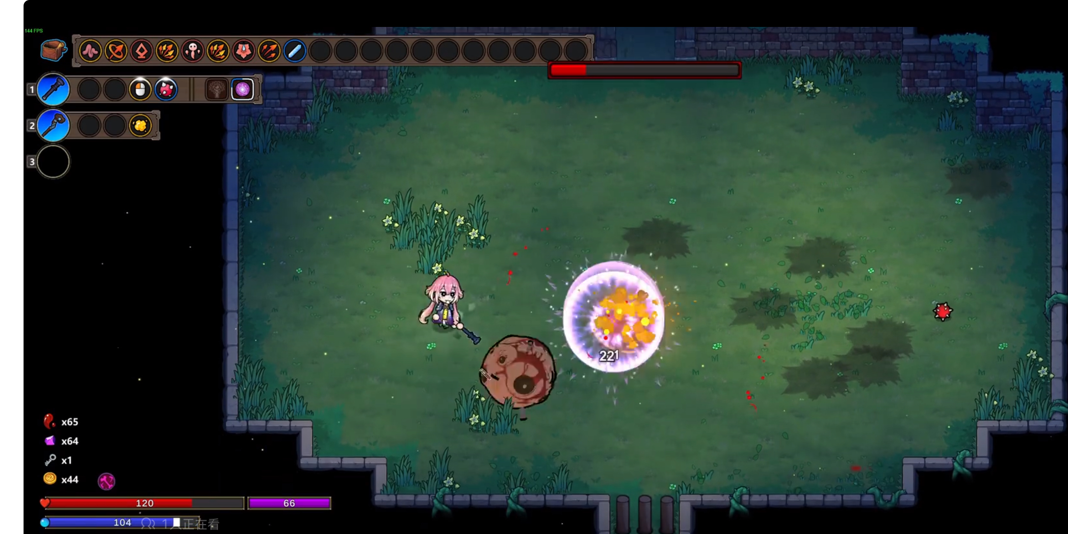 第五个是个boss,无序残骸,血量有1700,有三种攻击方式,第一种是会不停的冲我们滚过来,而且速度特别快,撞墙之后还会喷出弹幕,这个就只能通过走位来躲避。第二种攻击方式是跳起来在空中旋转之后向我们滚过来,然后撞墙之后喷出大量的弹幕,还是通过走位来躲避。第三种攻击方式和第二种一样,只是在冲过来的过程中会加速,我们依然还是靠走位来躲避伤害。这个boss很容易破无伤,而且弹幕发射很多,不过伤害值不是很高,我们可以躲在右下角和两个方框处,用走位躲避就可以了。