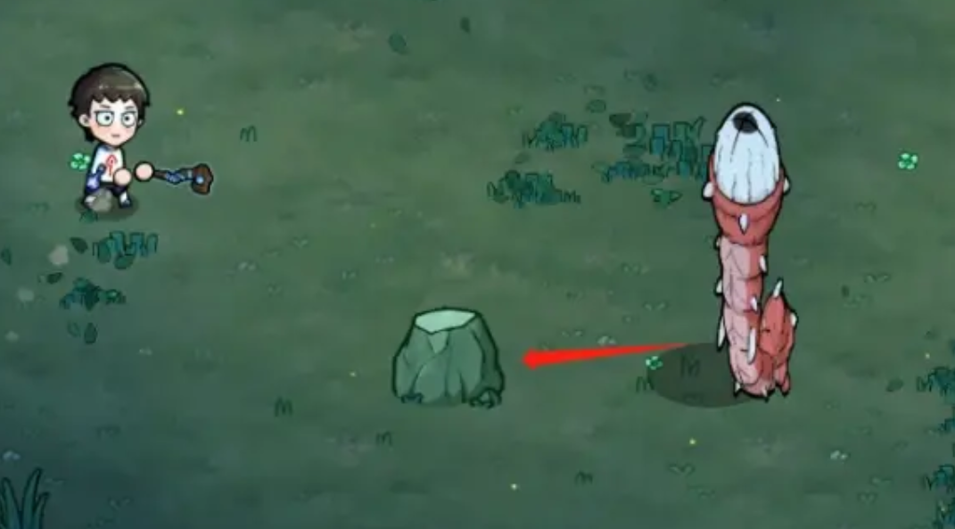游荡蠕虫第一种攻击方式就是站定时身体变长然后撞击前方。玩家此时要利用好地图上的地形来躲避。游戏场景里分布着许多石头,用这些石头做掩护可以很好地避开游荡蠕虫的撞击攻击。面对如此直接而强大的攻击,玩家应该时时刻刻保持警惕,随时寻找遮蔽物保证自己的安全。