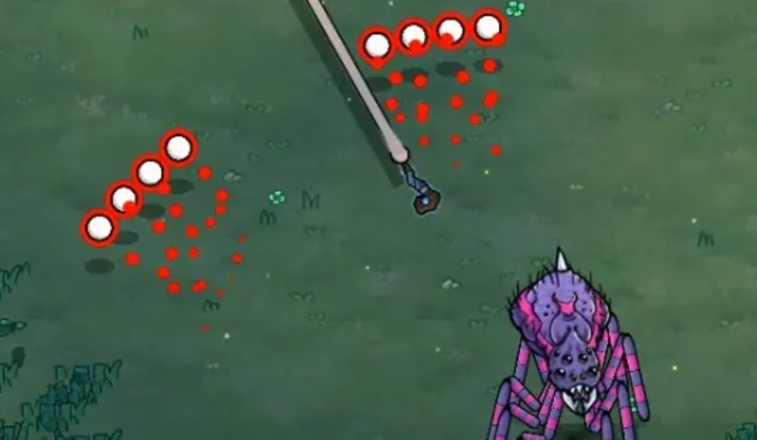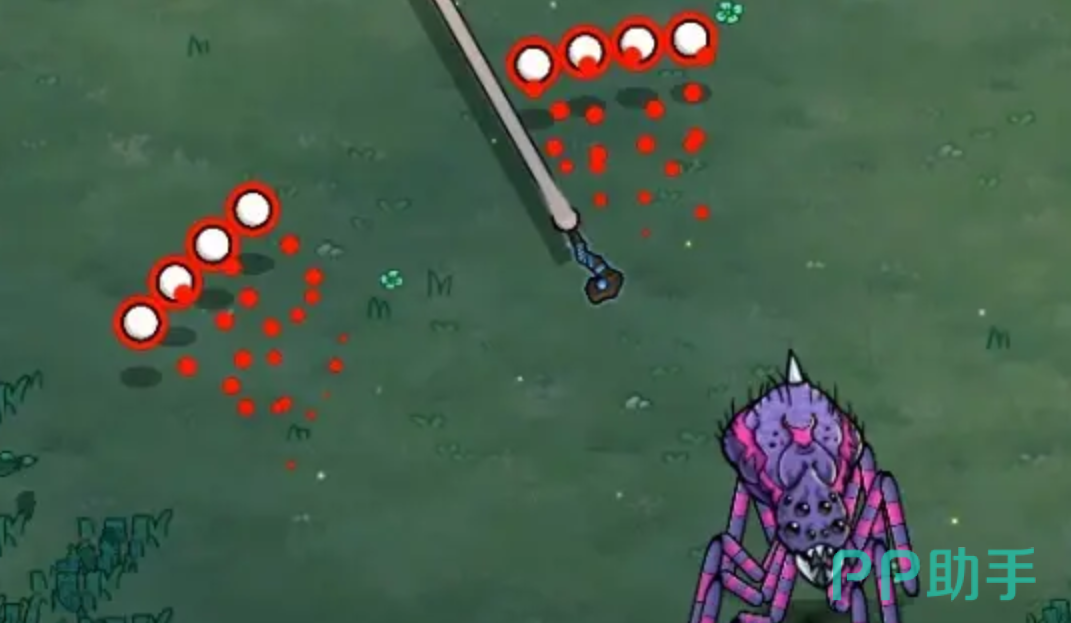 第二种攻击方式为合并弹幕攻击。巨蛛发射出五个弹幕,然后合并成一排向外面扩散。对付该种攻击方式的最佳方法就是和巨蛛保持一定的距离。当巨蛛准备发射弹幕的时候,玩家要根据情况及时走位、闪避,就可以有效地应对并且降低受到攻击的风险。