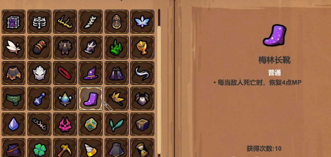 第一件遗物套装的名字是梅林套。梅林套包括梅林帽、梅林法袍、梅林长须、梅林长靴四件装备。梅林帽的魔法值上限提高了20点,在游戏后期魔法值不够的时候很有用。梅林法袍有2%的魔法恢复增加效果,使玩家在战斗中能坚持更久,不会频繁出现魔法耗尽的情况。梅林长须使角色召唤物的数量翻倍,成为所有召唤流角色必须拥有的核心遗物。梅林长靴在击杀敌人之后可以立刻回4点蓝,面对大量的敌人时就显得非常重要了。组合齐全之后,梅林套可以大幅提高玩家的魔力上限到300点,让角色在战斗中更加得心应手。