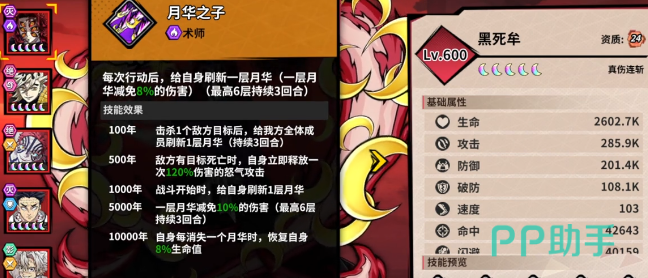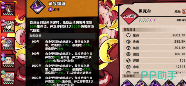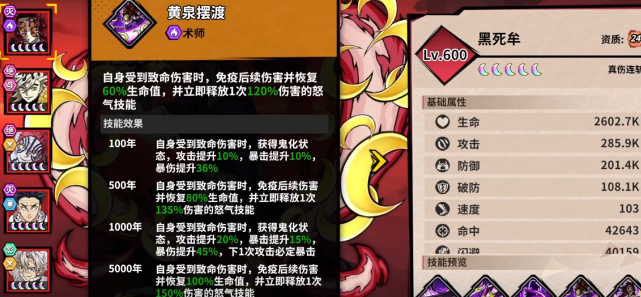 2602.7的生命值,就可以把脆皮法师的标签全部都撕得粉碎。会拥有较出色的碾压,而且还能够穿透闪避流。更离谱的是,有103的速度,让他就可以在多数输出之前直接叠起增益,真正做到又肉又快又能打。黄泉摆渡是核心的技能,被称之为残血反杀教科书,只要吃到致命伤,不仅可以锁血回60%的生命,还可以直接炸出120%的怒气技能。等同于对面费了半天的劲,把他打到半残,可是反手就吃了一个满额的范围性伤害。