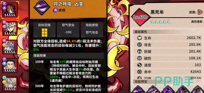 另外,100年可以叠加10%的攻击力暴击,500年就可以直接免伤,还可以加回怒,5000年就可以直接触发必暴击以及追加攻击的能力,越是挨打越是嚣张。输出端更有优势,月之呼吸一旦在释放之后,那就会造成全体94.4%的法术伤害,而且打一个少一个。每收掉一个目标,伤害就会上涨50%配合高命中,在面对残血的时候,那这一波伤害就等同于是收割镰刀。1000年的效果更厉害,在暴击之后就可以直接追加100%最大生命值伤害,哪怕是肉盾,也没有办法抵抗真实伤害补刀。5000年还可以给目标套护盾,可以一边打一边控场,输出辅助双拉满。