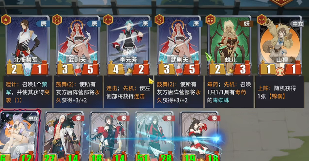 次推「召唤流」体系:由杨玉环、玄武、饕餮组成。杨玉环为核心输出载体,其「遗计」技能可在退场时召唤禁军——该单位具备五星角色级基础数值,是本体系的战力基石;玄武提供辅助增益,饕餮则提升召唤触发频次,二者协同可实现单回合同步登场四位禁军,瞬间建立兵力与属性双重优势。建议搭配武则天等群体属性强化角色,进一步放大禁军面板,达成数值层面的绝对压制。
