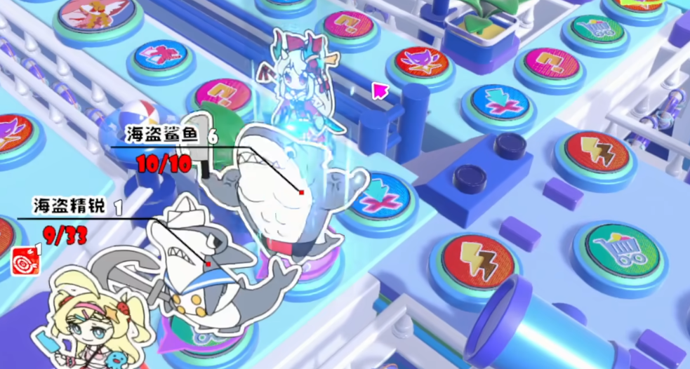 当进度推进至第三阶段,Boss“海盗嘎乌”正式登场。此时它处于静默状态,不发动攻击,且拥有极高防御数值,常规物理输出角色对其几乎无法造成有效伤害,建议暂避其锋,优先清理其他目标。进入第五阶段后,将出现两名“鲨鱼精锐”,为本图强度最高的精英单位:每三回合可在自身前后一格范围内召唤一只海盗鲨鱼;被攻击时会触发反击,并在受击后永久提升自身攻击力。由于其成长型机制显著,若队伍缺乏爆发压制能力,不宜贸然集火。成功击败二者后,除获取对应筹码外,还可进一步削减Boss防御力,至此才真正开启对海盗嘎乌的有效输出窗口。