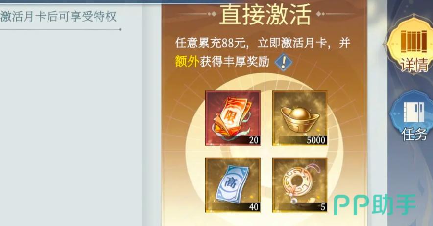 需注意的是,该月卡并非独立售卖,而是通过累计充值达88元自动激活。玩家可灵活搭配各类首充礼包、限时特惠包等组合达成门槛,无需额外单独支付固定费用。基础权益为每日可领取1000元宝,连续30天稳定发放,总计30000元宝。