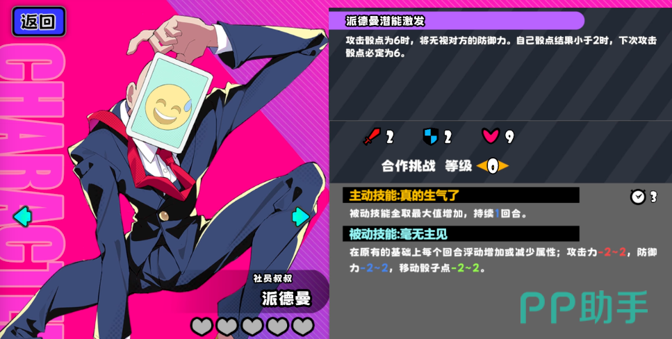 在实战定位上,派德曼属于高爆发核心输出(C位)。当角色被成功激活后,其“出刀骰六”机制可完全无视敌方防御属性,实现稳定穿透打击。推荐卡组搭配遥控器牌——该牌触发“遥控骰一”并突进门时,可稳定激活被动效果中的骰六判定。资源分配方面,建议优先配置提升基础白值输出与移动中输出能力的筹码组合,以最大化其持续作战效能。