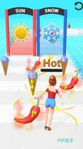 游戏的场景中一共有三个赛道,每一条赛道上所设置的障碍物也是不同的,玩家需要操控自己的角色在各个赛道上去收集辣椒,不断的提升角色的火辣指数,同时也要避开冰淇淋这一障碍物,如果碰到冰淇淋便会使角色的火辣指数得到降低。当火辣指数达到一定水平之后,便会吸引男主角,在到达最终的目的地之后火辣指数越高,吸引男主角的数量也会越多。
