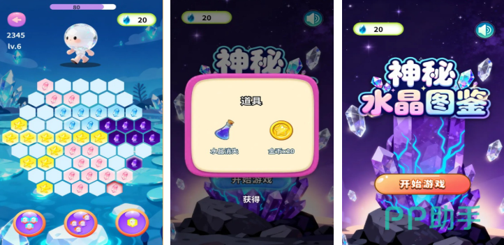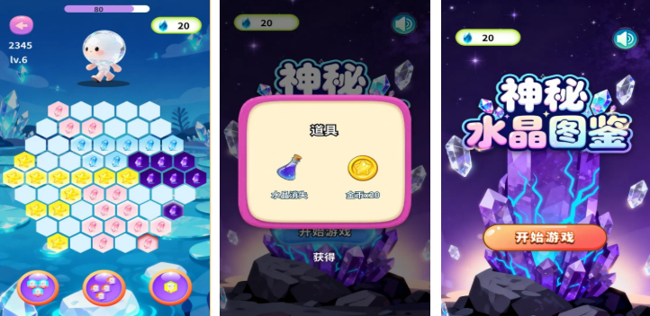 神秘水晶图鉴是款操作与众不同的消除类型闯关手游,独创的六角形地图和消除机制让游戏更显有趣,整体消除节奏很快且气氛渲染更有神秘感,神秘道具纷至沓来等待着玩家解锁完成过任务,更多的资源补给加快了游戏的闯关效率,众多的关卡加持让这款神秘游戏更具解压感,欢迎神秘游戏爱好者安装神秘水晶图鉴尽情尝试。