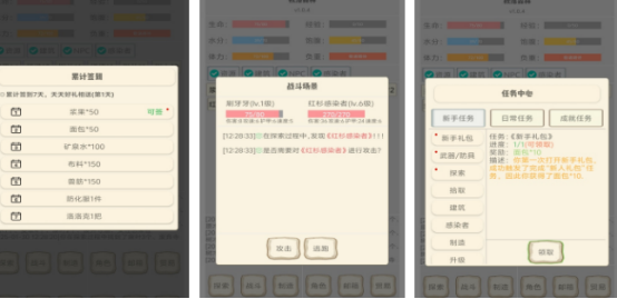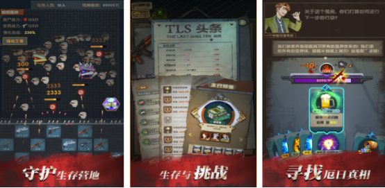 文字为题材的经营作品,纯文字形式展现,有真实具有极强代入感的剧情发展,探索文字,并点击选项,完成决策,每日行动点数可用于不同的工作,有采集制作等,很多行动都受体力限制与约束。玩家要在非常危险的末日环境中进行建设与修缮,将简陋庇护所升级为坚固堡垒,组建幸存者小队探索不同故事背景,对抗僵尸浪潮。