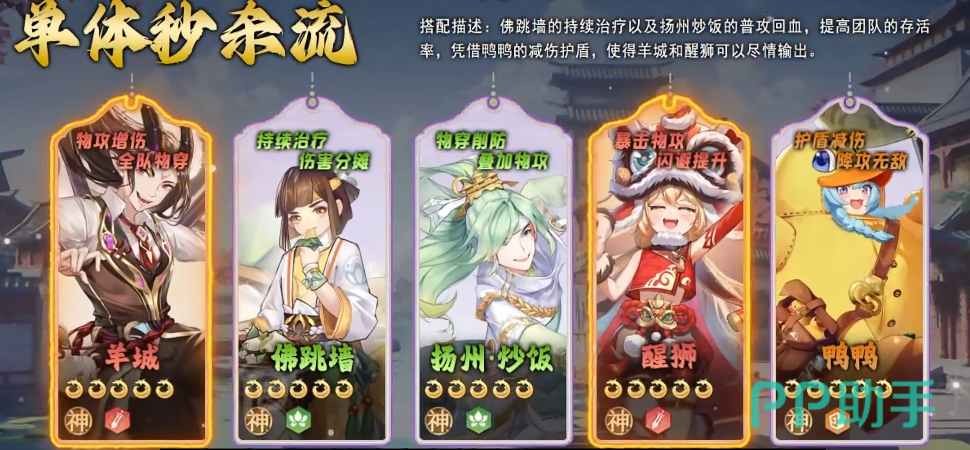 第二个为大家推荐的就是单体秒杀流,这个阵容里面大家可以用到的搭配角色,包括佛跳墙+扬州炒饭+羊城+醒狮+鸭鸭,这个阵容进行搭配组合的时候,大家就注意阵容里面的核心角色就是佛跳墙,因为她的核心能力可以通过自己的持续治疗带来足够的续航时间,而扬州炒饭的也是有类似的效果,在技能使用的时候,可以根据她的普攻进行输出之后还给自身带来一定的回血,所以在团队的生存能力非常强,出站时候都要走一个长时间的输出流派就比较合适了。