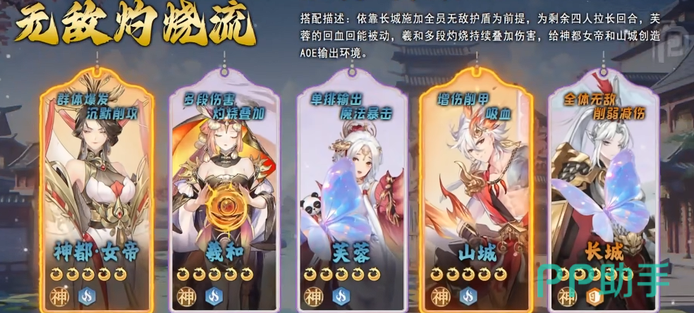 灼烧流里面其实持续伤害的效果是比较无敌的,这个阵容里面大家可以选用的卡牌有,芙蓉+山城+女帝+长城+羲和来进行组成,阵容组合成之后,其中核心的效果就是可以利用长城提供的一个护盾,给其他的队员带来足够的防御能力,而且进入了这个无敌状态之后长城她也可以提升整体队伍需要的生存回合,在延长时间上面她是有足够的机制可以利用起来,而芙蓉的话她放在这里,根据自身的被动技能可以给队伍带来的回复,以及上面包括了生命还有能量的数值也不错。