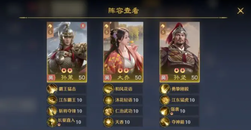 而在技能升级以及整体阵型适配的效果上面,大家就要注意深度搭配的时候,前期的一个平民阵容更适合搭配的就是大乔,孙坚以及孙策这样的一个组合,也是目前在我国阵营里面比较突出的一个阵营组合效果,在其中三个角色都是可以通过活动来获取的,但是针对于新手需要的资源节省度来看的话,其实他们拥有的一个最大优势还是在于战损的概率上面数值非常低,所以前期大家在推图或者是掠夺一些资源的时候,就都可以用的上他们,而用这些角色的话,大家就要注意他们因为同属于一个阵营里面出来的武将,所以在后期的一个阵营加成效果当中也可以进行激活,这样在激活了羁绊整体能力之后,他们还会有一些群体的增益、治疗效果,让阵容里面的爆发输出特性更强一些。