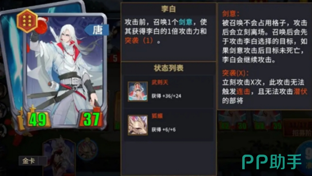 另外,在实战中大家也可以让武则天上场参加战斗,去亲身体验一下鼓舞技能在战场上能够带来什么样的技能效果。实战中秦琼是前排的防御主力,他可以帮助吸引对方的火力值,保护后排输出不被打扰。上官婉儿能够加快我方的卡牌获取速度,同时还能够为麒麟提供额外的卡牌。长孙无忌可以和李白进行配合,他们两搭配的话可以提升李白的属性。有了武则天的加入那么就可以让爆发伤害提前成型,为我们带来更多的输出优势。