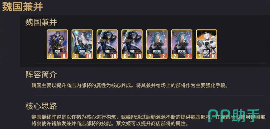 阵容核心逻辑围绕“兼并”机制展开:通过持续将商店刷新的魏国部将转化为许褚的属性养料,实现单核指数级成长。许褚作为终极主C,在准备阶段可主动兼并场上魏国武将,直接继承其全部基础属性(含攻击力、生命值、防御力等),后期成长为兼具坦度与输出的移动堡垒。甄姬承担关键辅助职能,其后勤技能可持续刷新魏国部将,确保许褚每回合均有充足兼并目标;蔡文姬则提升商店内所有部将的基础属性,显著放大每次兼并的收益转化效率。