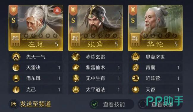 战法配置方面,华佗优先选择兼具治疗与减伤效果的技能,例如刮骨疗毒、资军后勤、天香;左慈与张角则侧重携带雷暴、借东风、太平道法、克己等高发动率谋略主动技,强化技能连锁反应与瞬时输出强度。